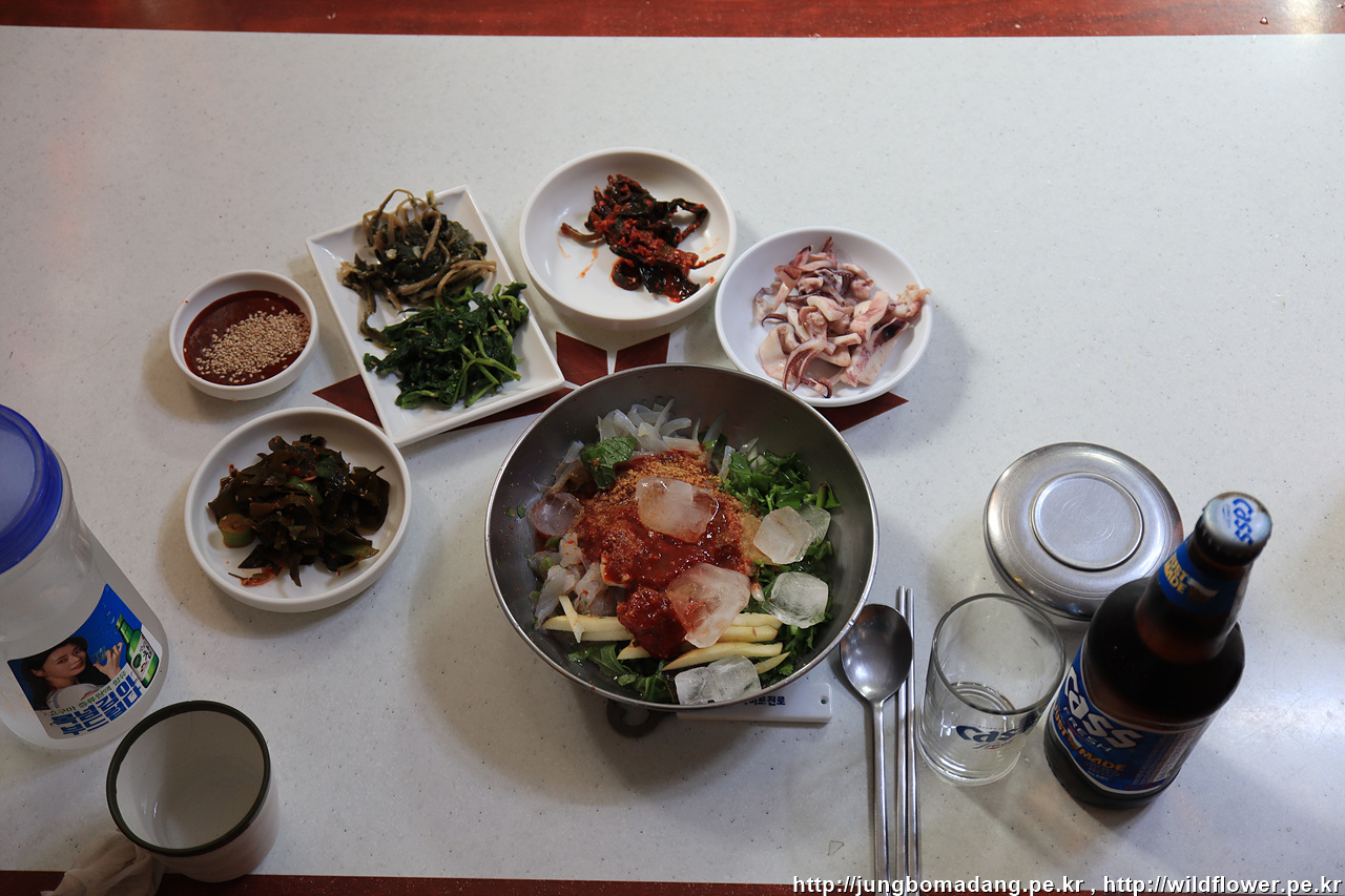 울릉도는 포항식 물회는 아니네요. 물도 있고 얼음 넣어 주네요. 반찬으로 삶은오징어는 역시 울릉도라서 ^^