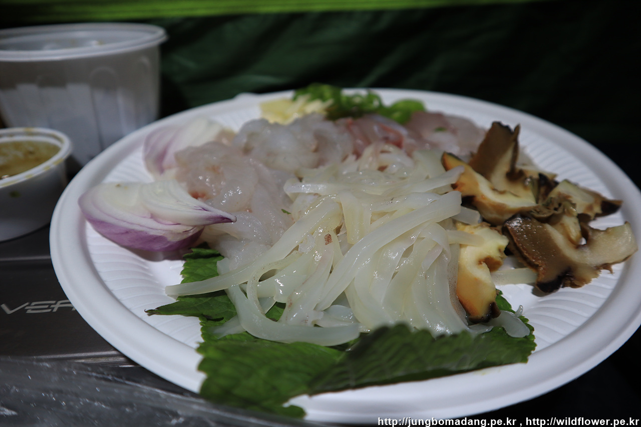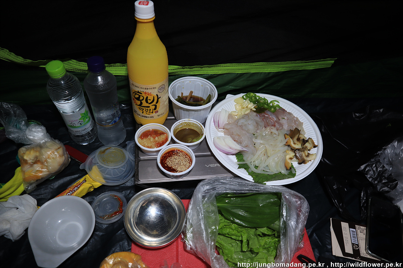 그렇게 두시간 정도 기다려서 저녁 8시쯤 남사장님이 무사히 복귀하셔서 배낭을 건네 받고 미리 주문한 회 3만원어치를 들고 기다리느라 고생했다고 막걸리도 선뜻 그냥 주셔서 오늘은 막걸리 한병으로 버텨야 합니다. 회 양이 종류도 다양하고 꽤 많네요.