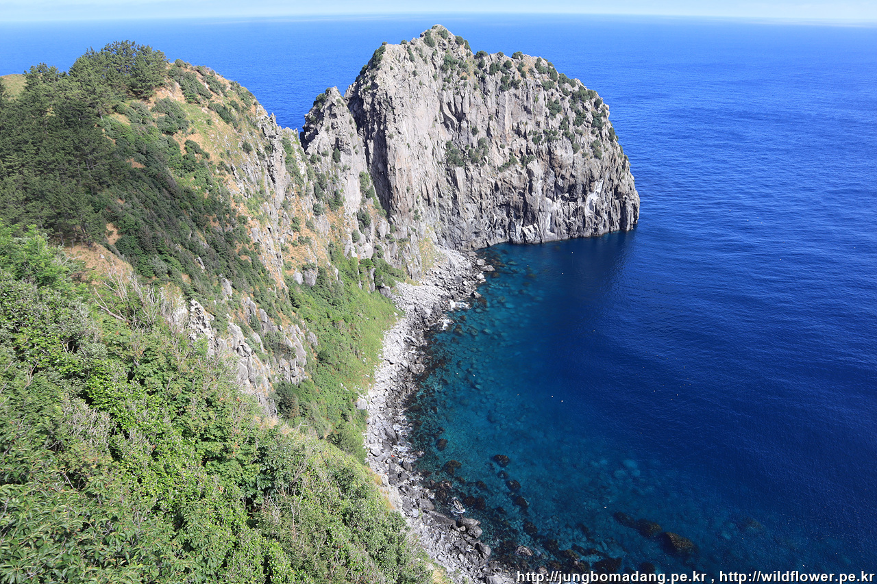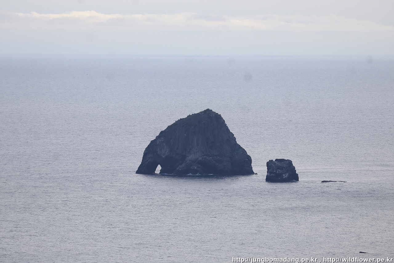 비경도 바라봅니다. 저 끝에 송곳봉도 보입니다. 바다 쪽에는 코끼리바위도. 절벽 부근에 하얀 점들은 괭이갈매기 입니다.