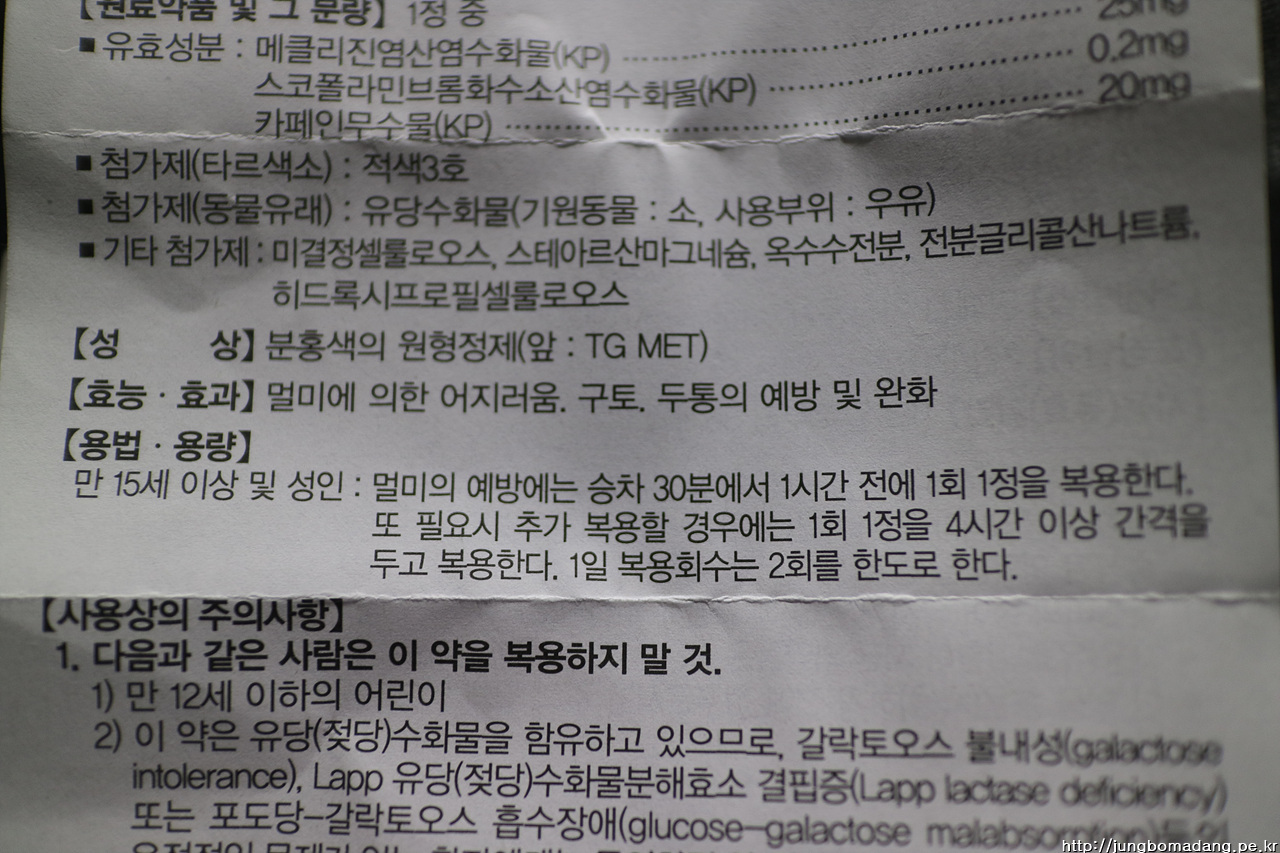 가장 중요한 멀미약도 동네 약국에서 구매합니다. 생각해보니 배만 거의 10시간을 타야 하다니... 2알 들어 있는 것을 2상자를 구매했는 데, 알고보니 하루에 최대 2알 이상 먹으면 안된다고 써 있네요. 1,000원씩 총 2,000원 지출