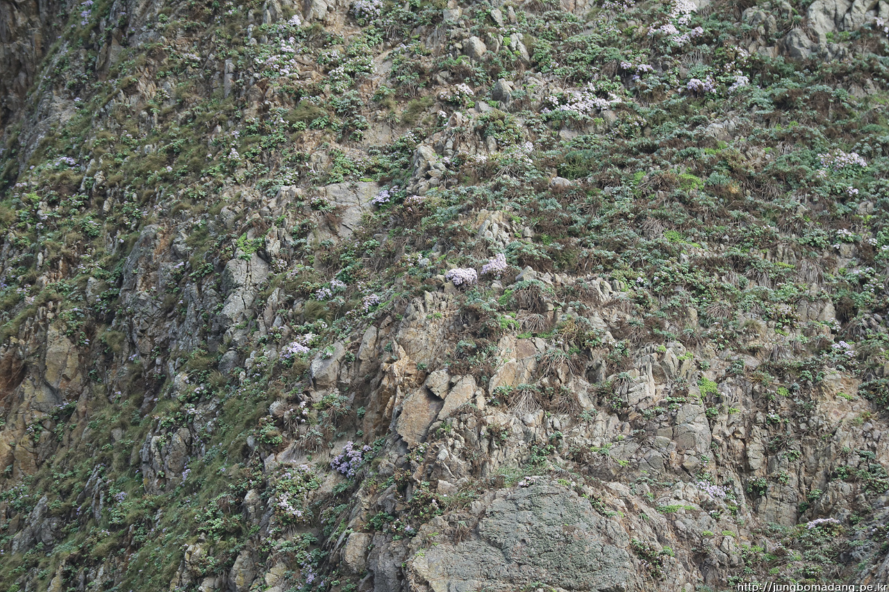 잘 보이지는 않지만, 망원으로 땡긴 이 곳에 야생화(해국)가 자리 잡고 있습니다. 민간인은 접근 불가한 가파른 바위 에 말이죠.