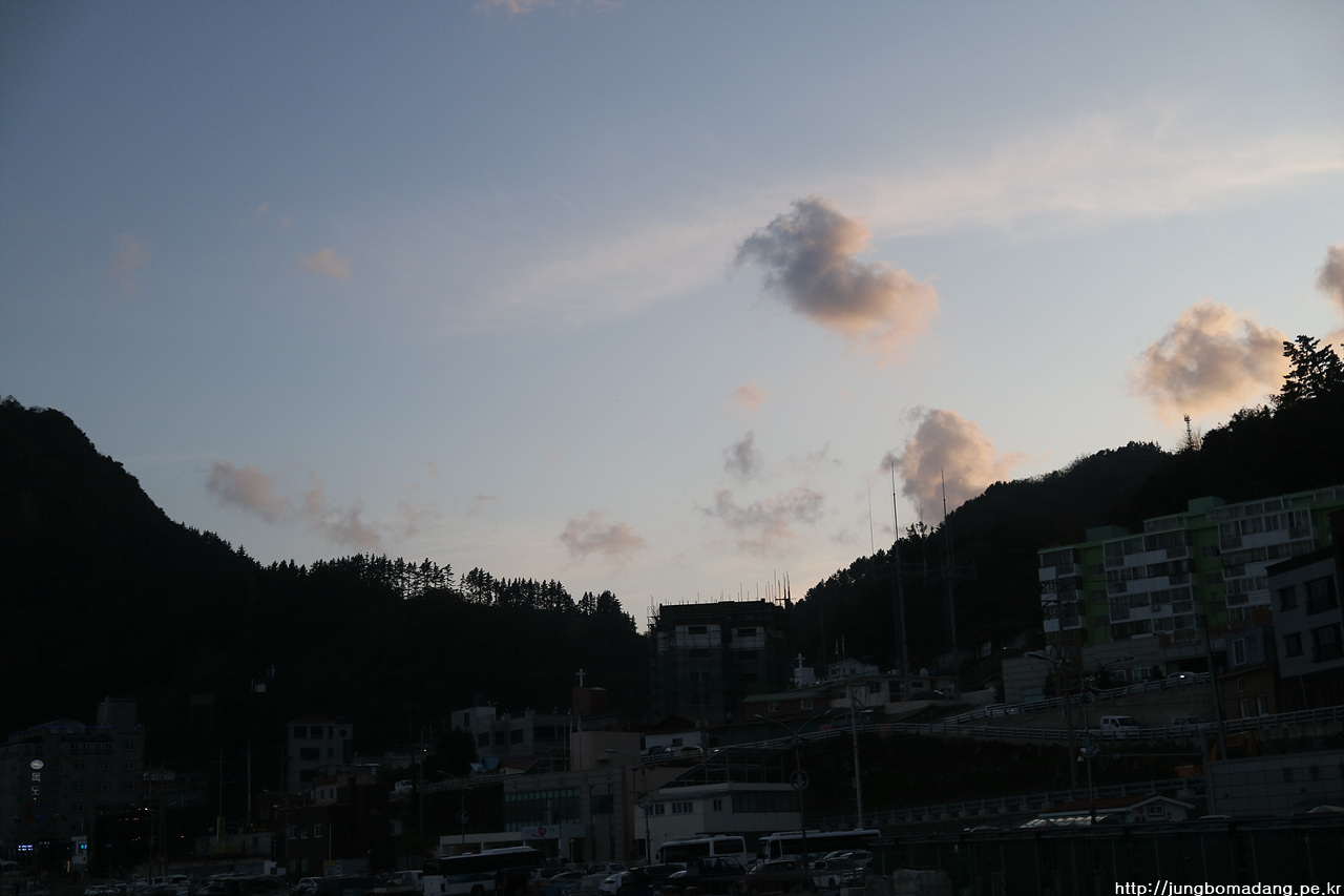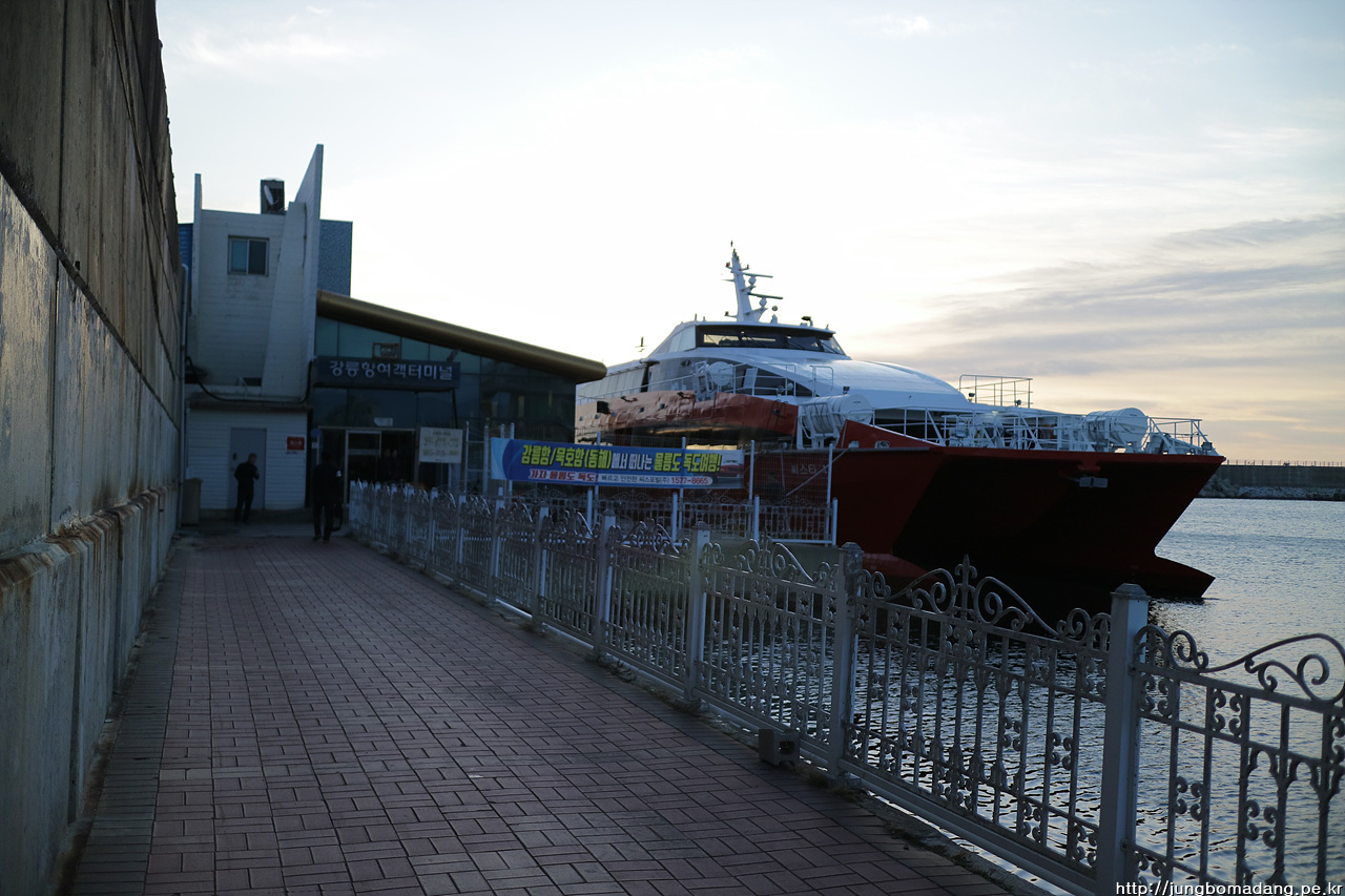 07시 08분 강릉(안목항) 도착! - 날씨는 그럭 저럭 괜찮아 보이네요. 출발할 때 기사님이 바다 기상이 안좋아서 울릉도에서 배가 빨리 돌아올 수도 있다고 그러네요, 그럼 독도는?