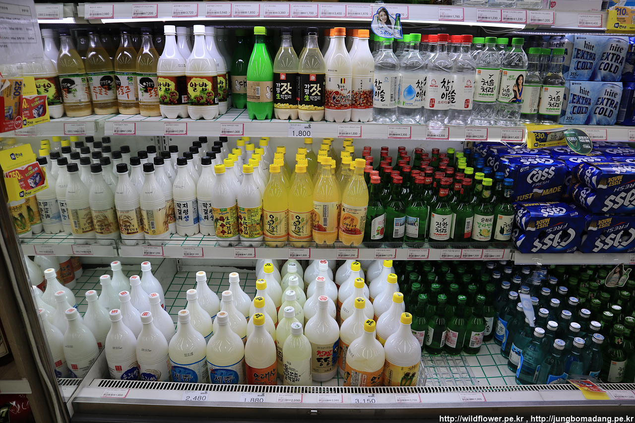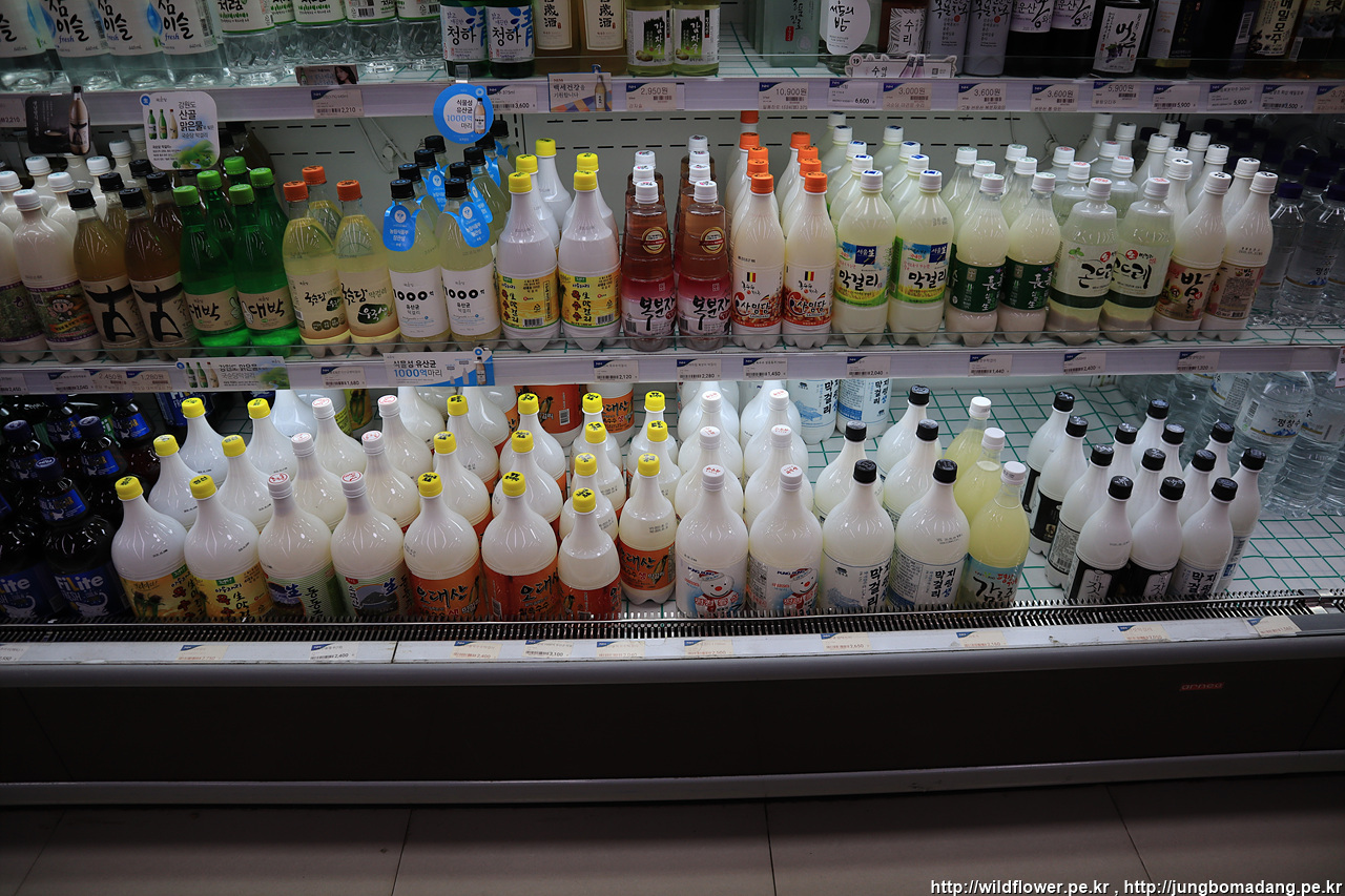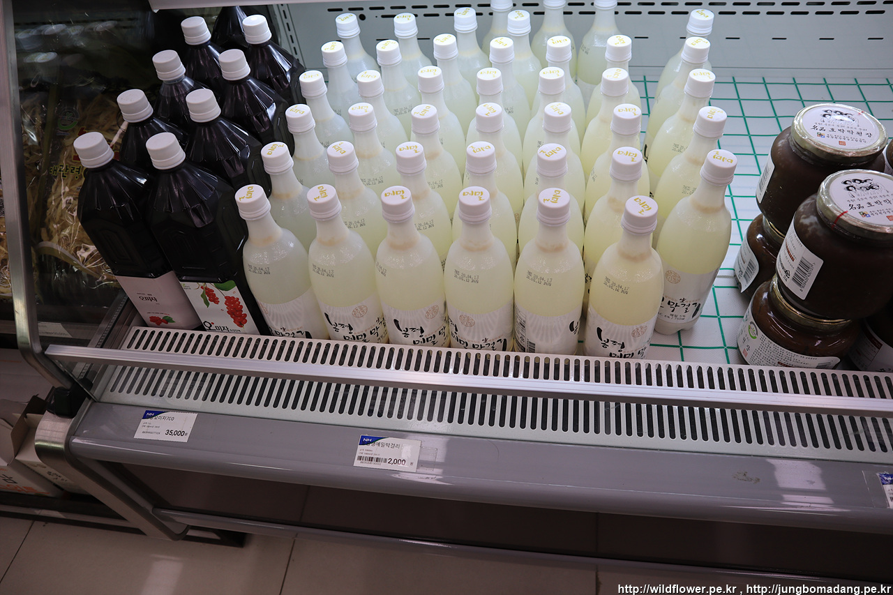막걸리 종류가 참 많죠? 가운데 눈사람 그려진 건 원주에서 만든겁니다. 가운데줄 젤 좌측 허생원 메밀 막걸리 3병 겟