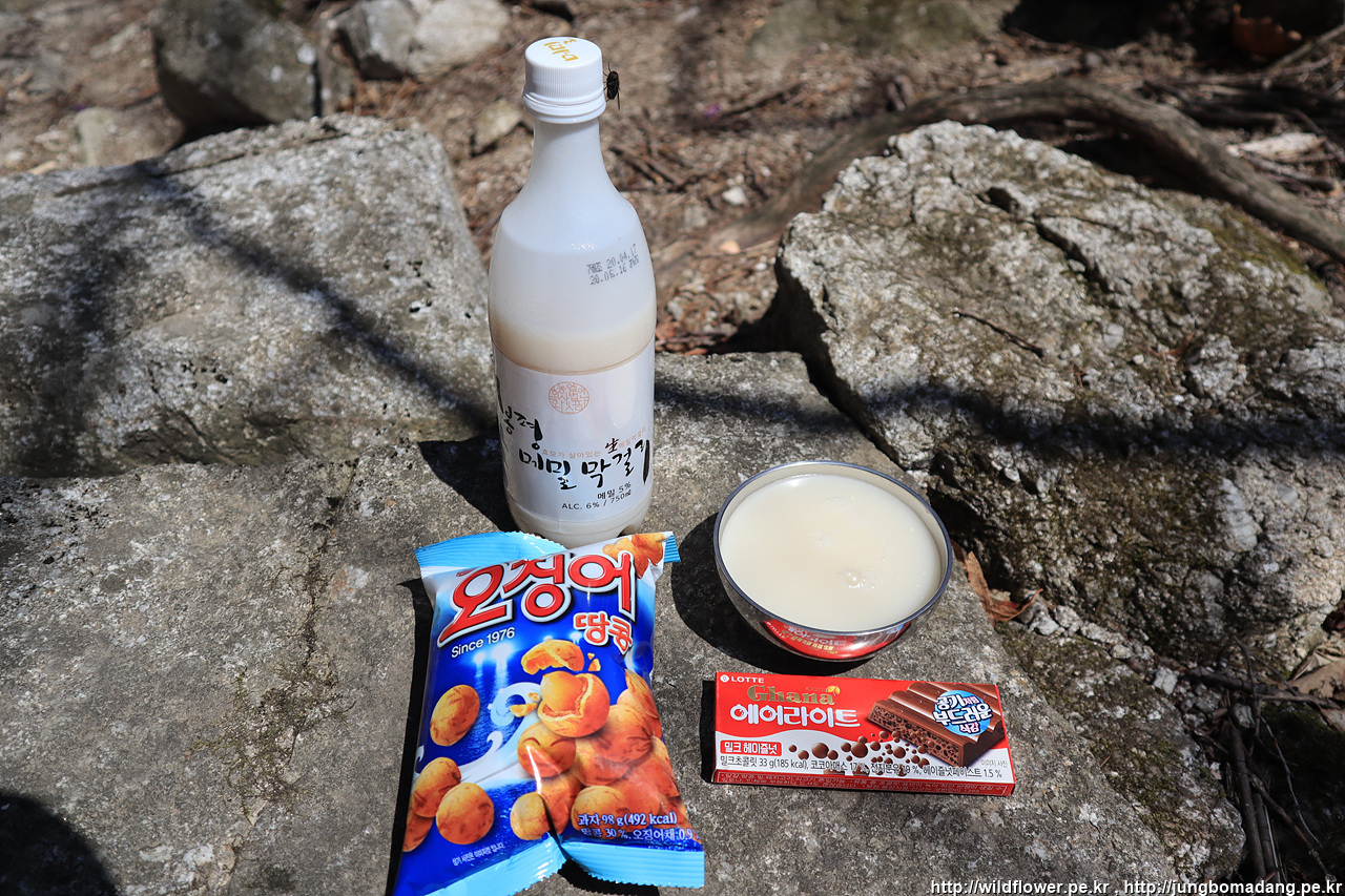 쉬어가기 좋은 반듯한 바윗돌 위에 자리 잡습니다. 하나로마트에서 턴 물건들... 고래밥은 집에서.