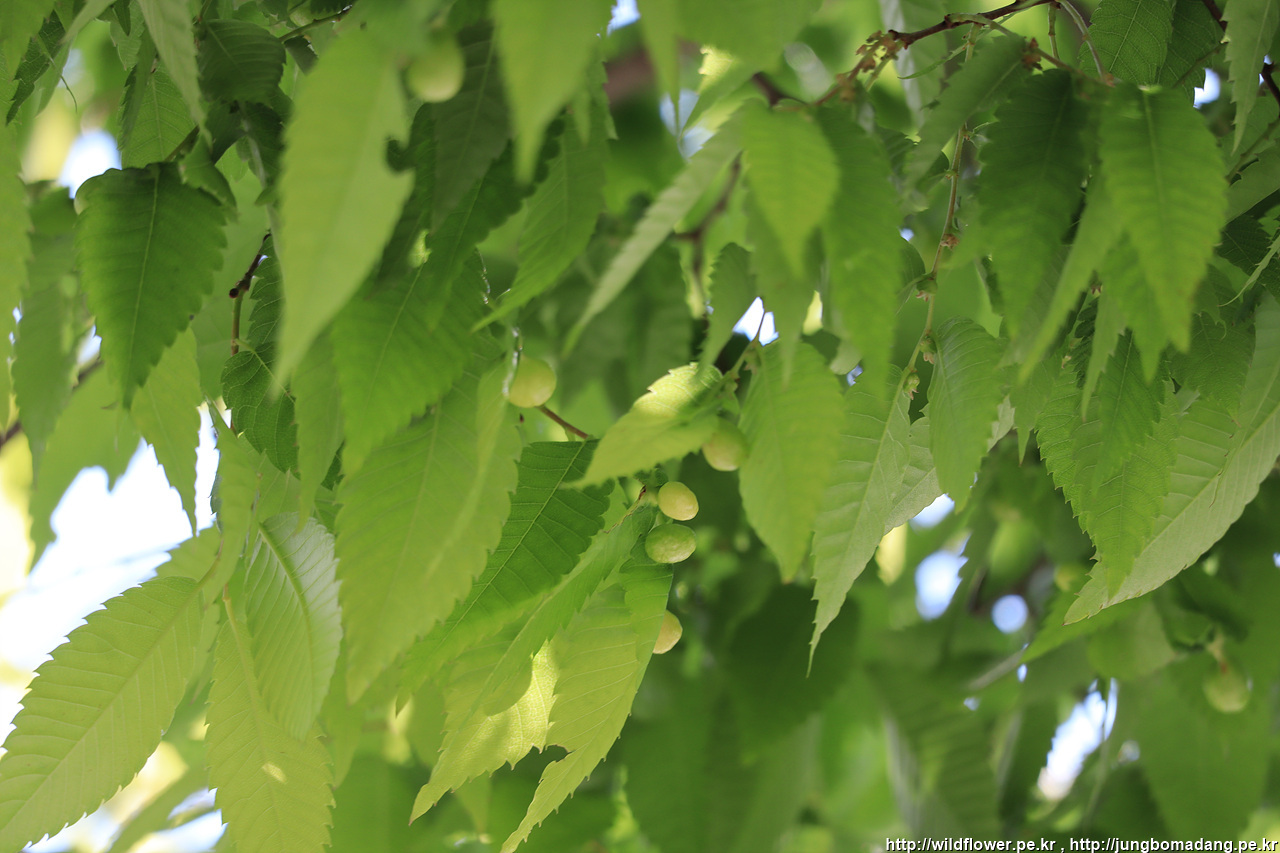 벚나무 열매인 버찌가 익기를 기다리는 중이네요.