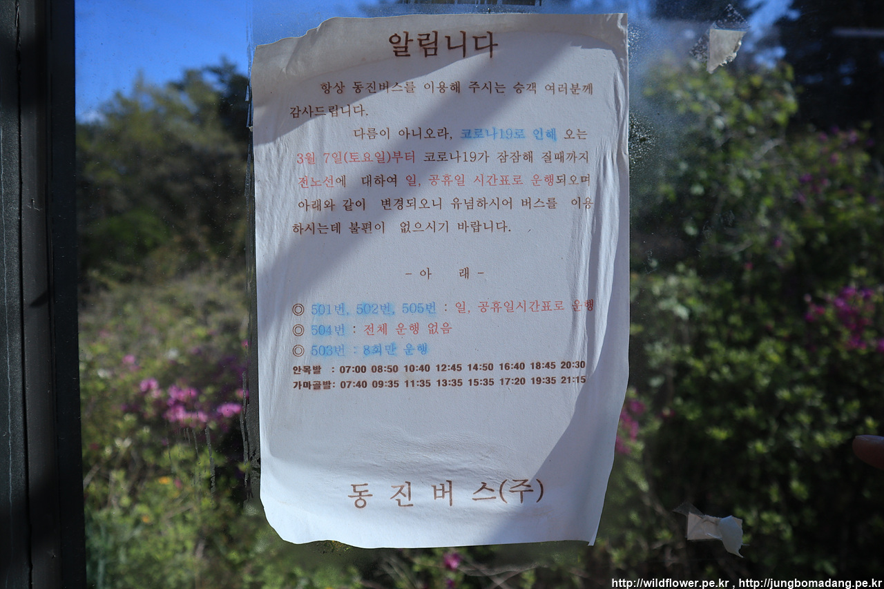 그리고 우측에 이렇게 중국 우한발 폐렴이 창궐한 요즘 시기에 적용되는 시간표입니다. 15시 35분 뒤에 2시간 후인 17시 20분에 버스가 있는 데, 첨엔 17시 20분 버스를 생각했다가 웬지 가능할 거 같아서 미친듯이 걸어서 15시 35분 버스 15분 전에 도착했네요.