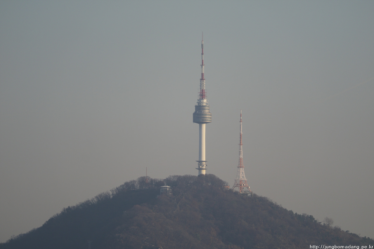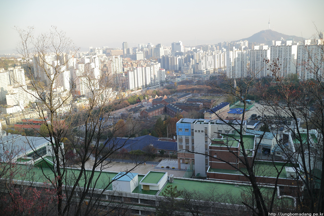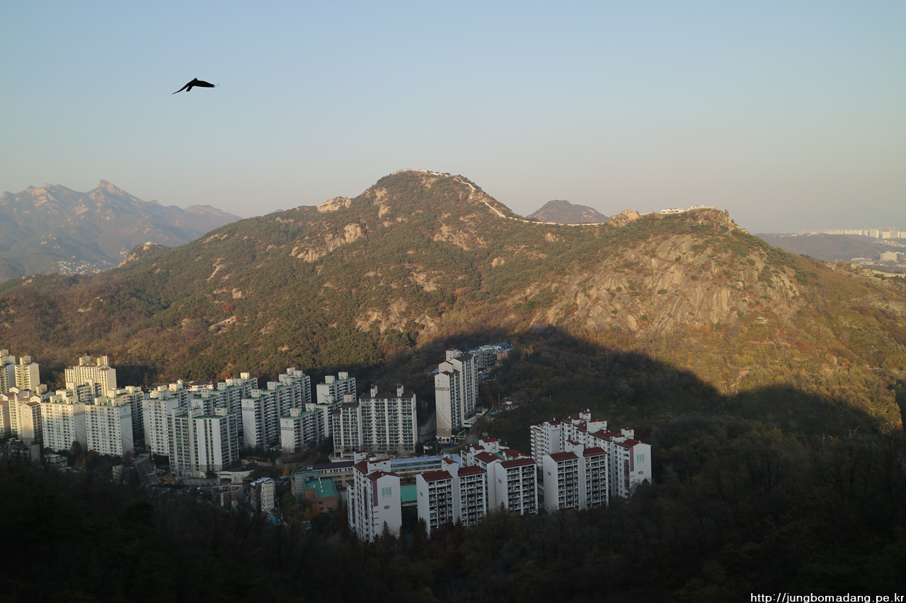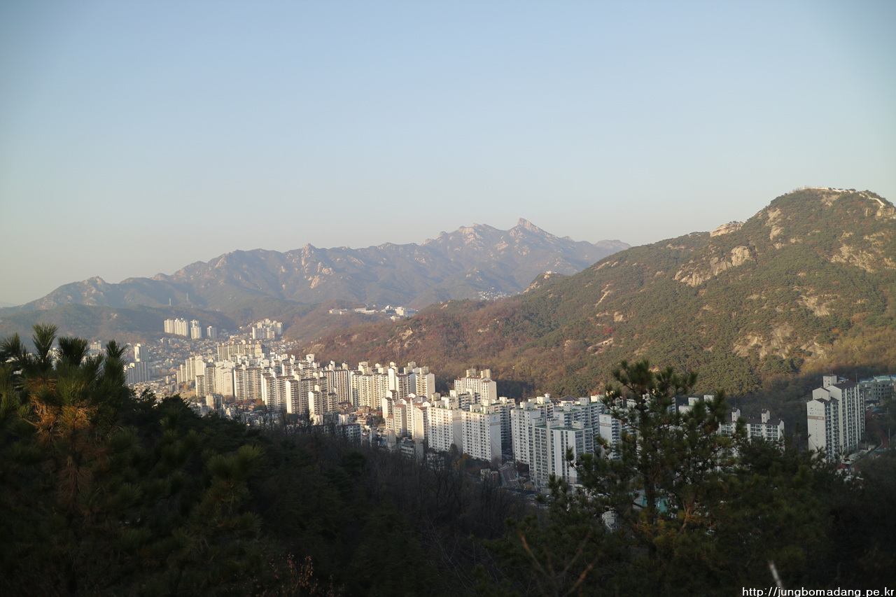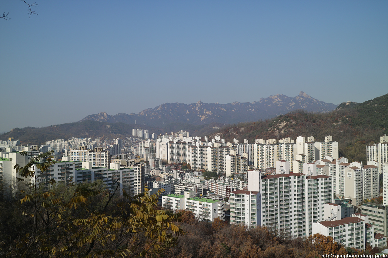 먼망대에서 바라본 인왕산 그 뒷편으로 북한산, 뒷우측편에 북악산