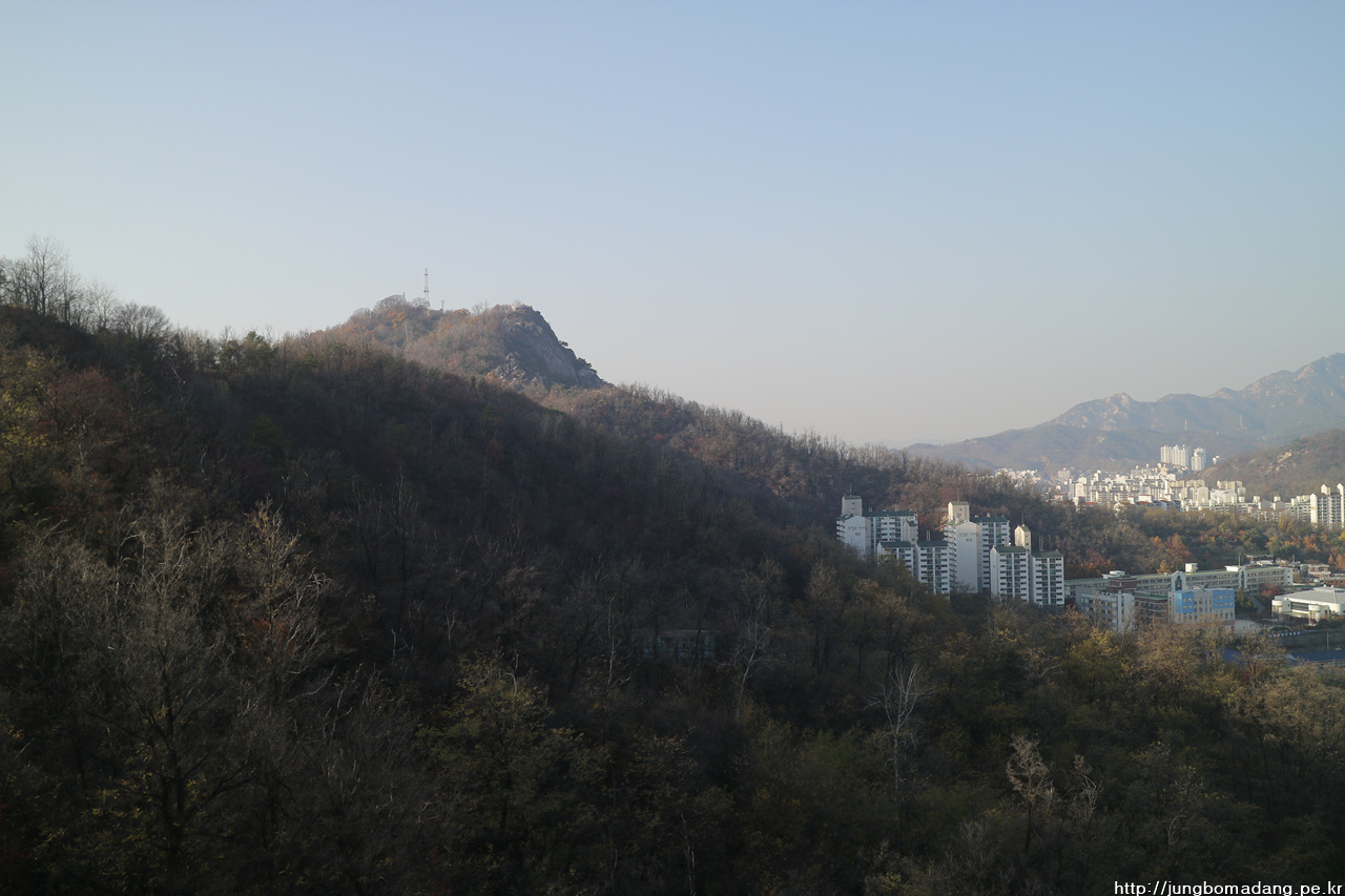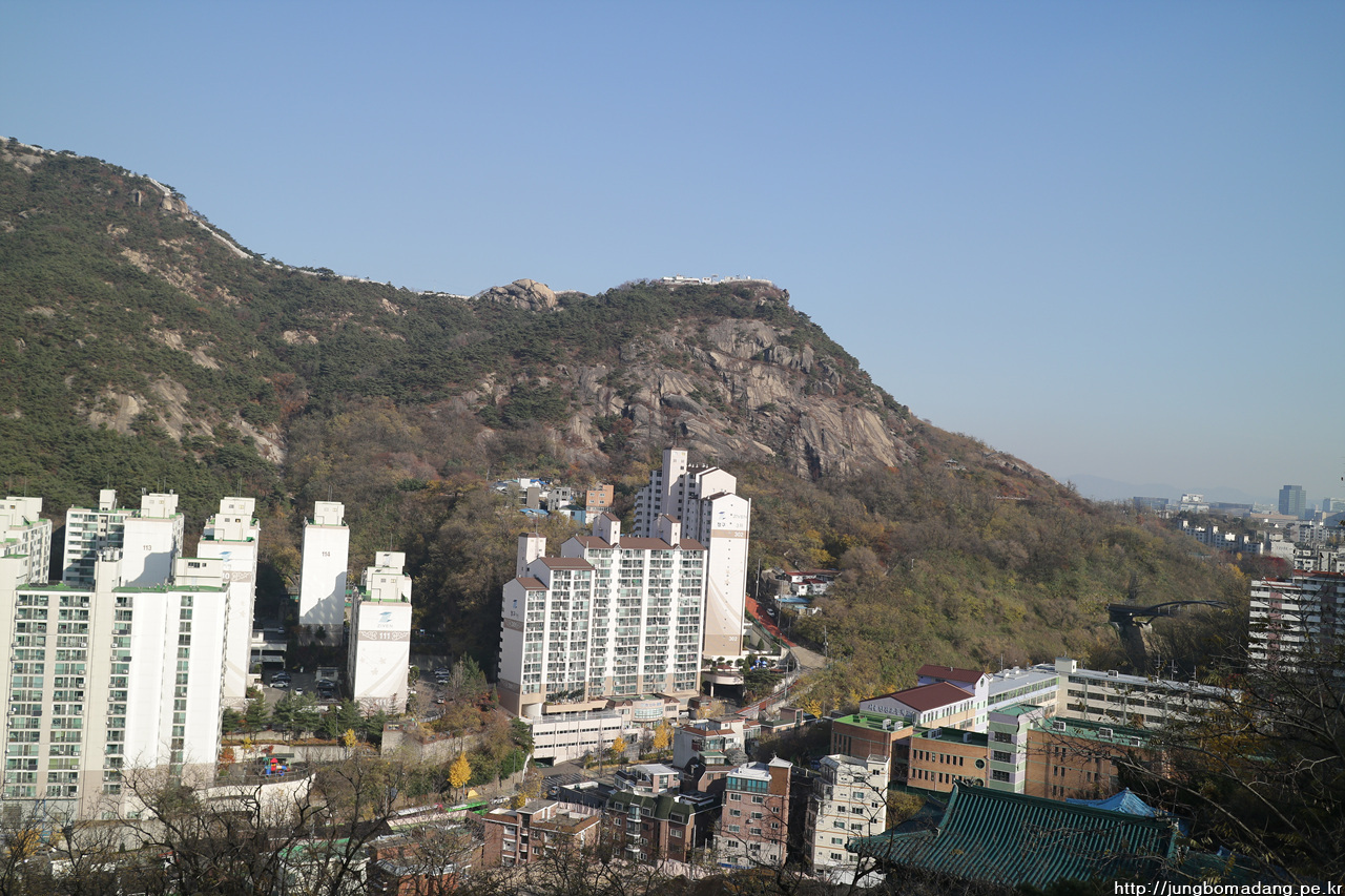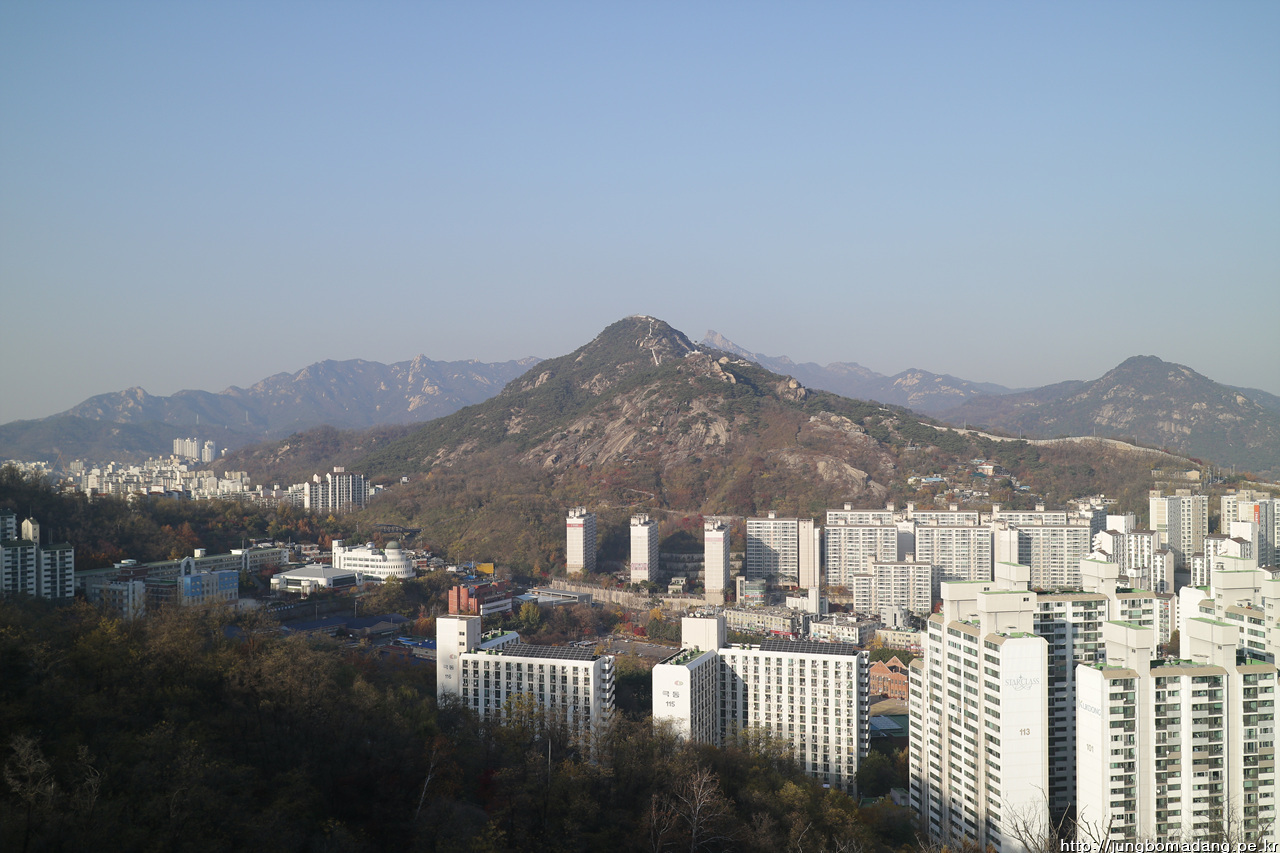 먼망대에서 바라본 인왕산 그 뒷편으로 북한산, 뒷우측편에 북악산