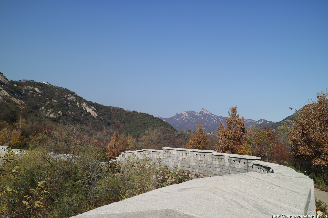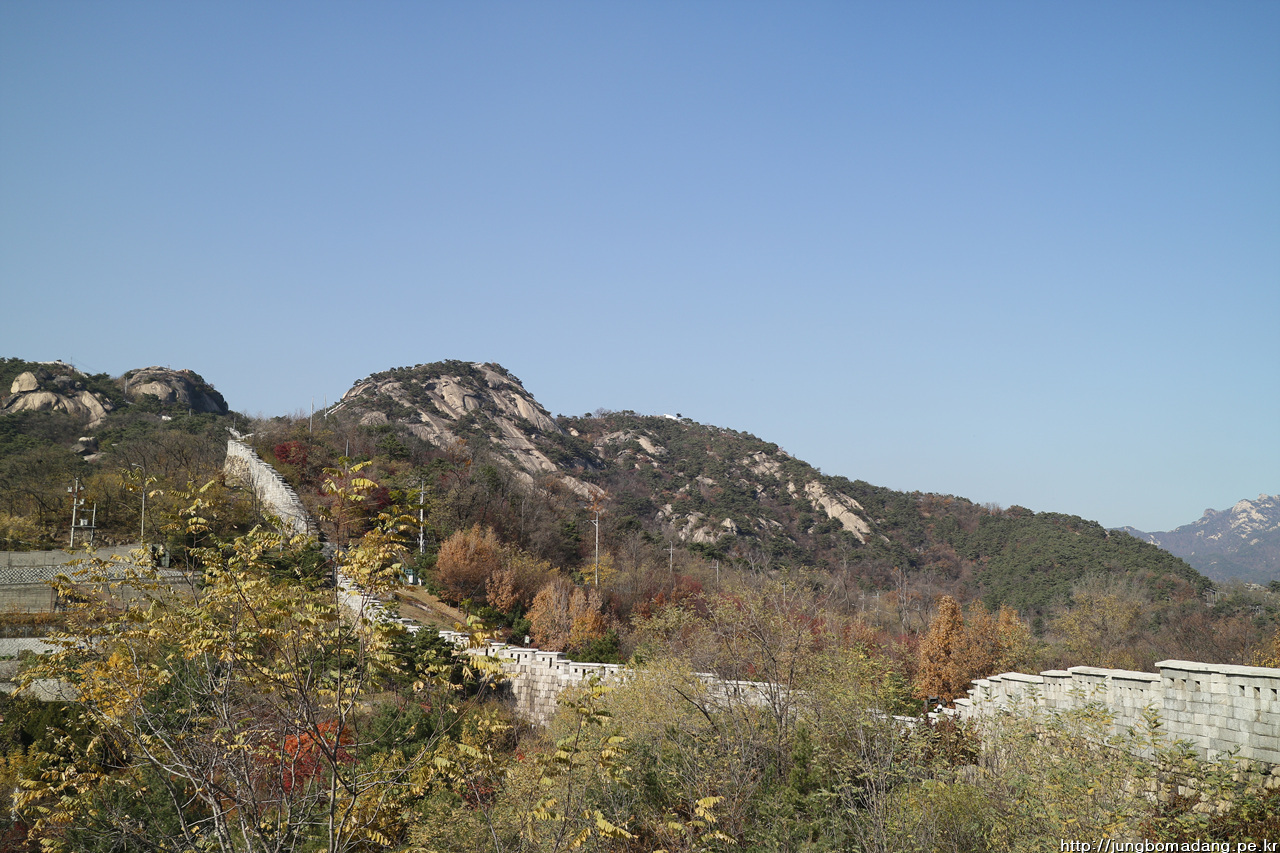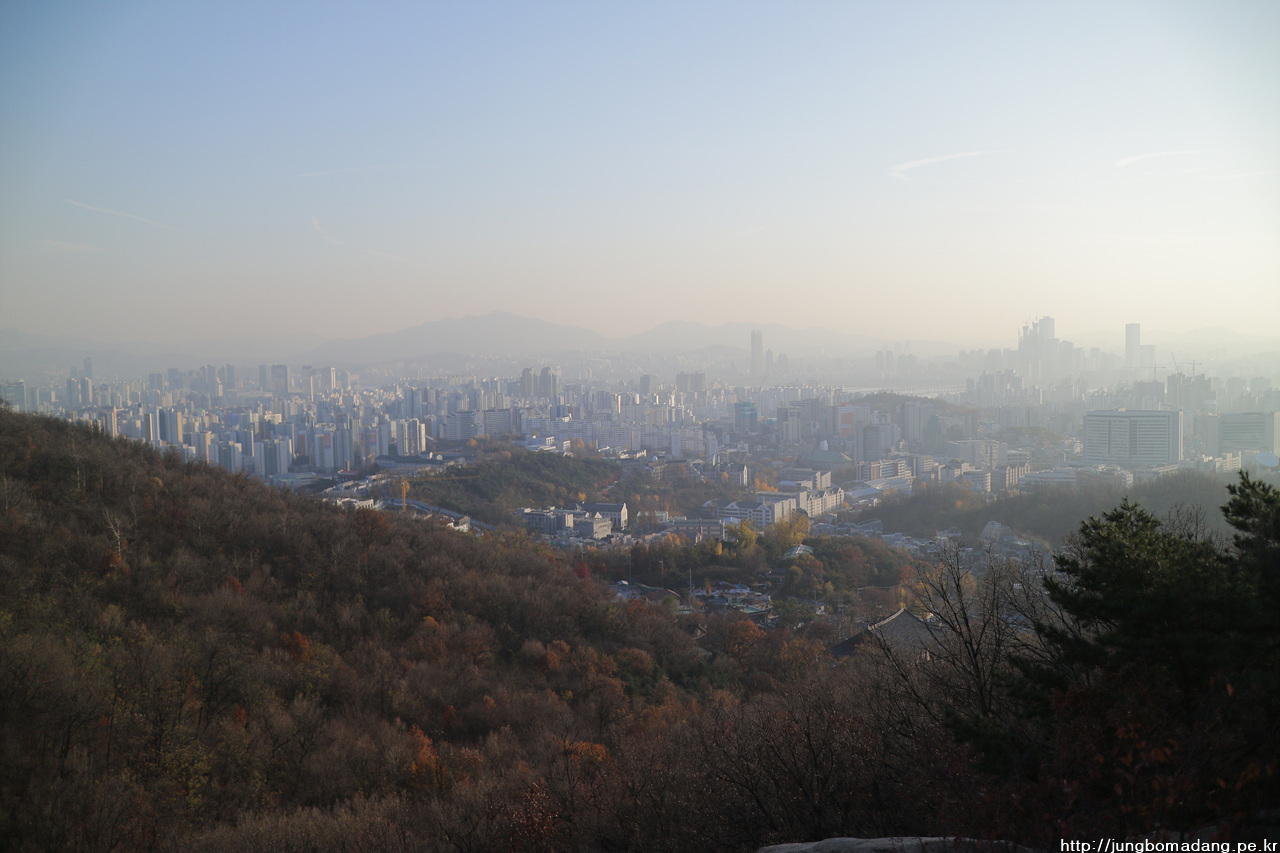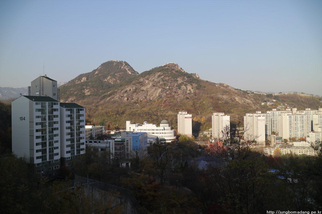 먼망대에서 바라본 인왕산 그 뒷편으로 북한산, 뒷우측편에 북악산