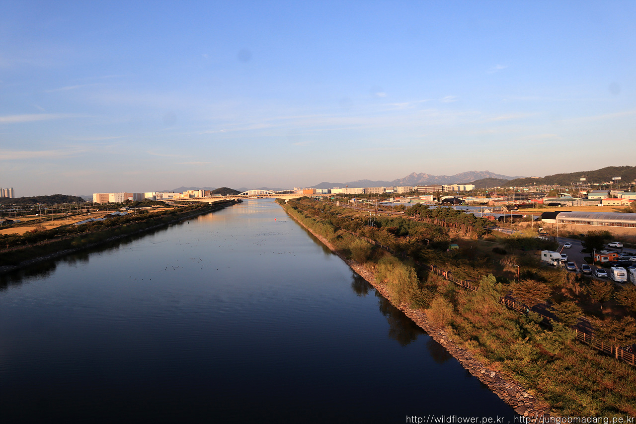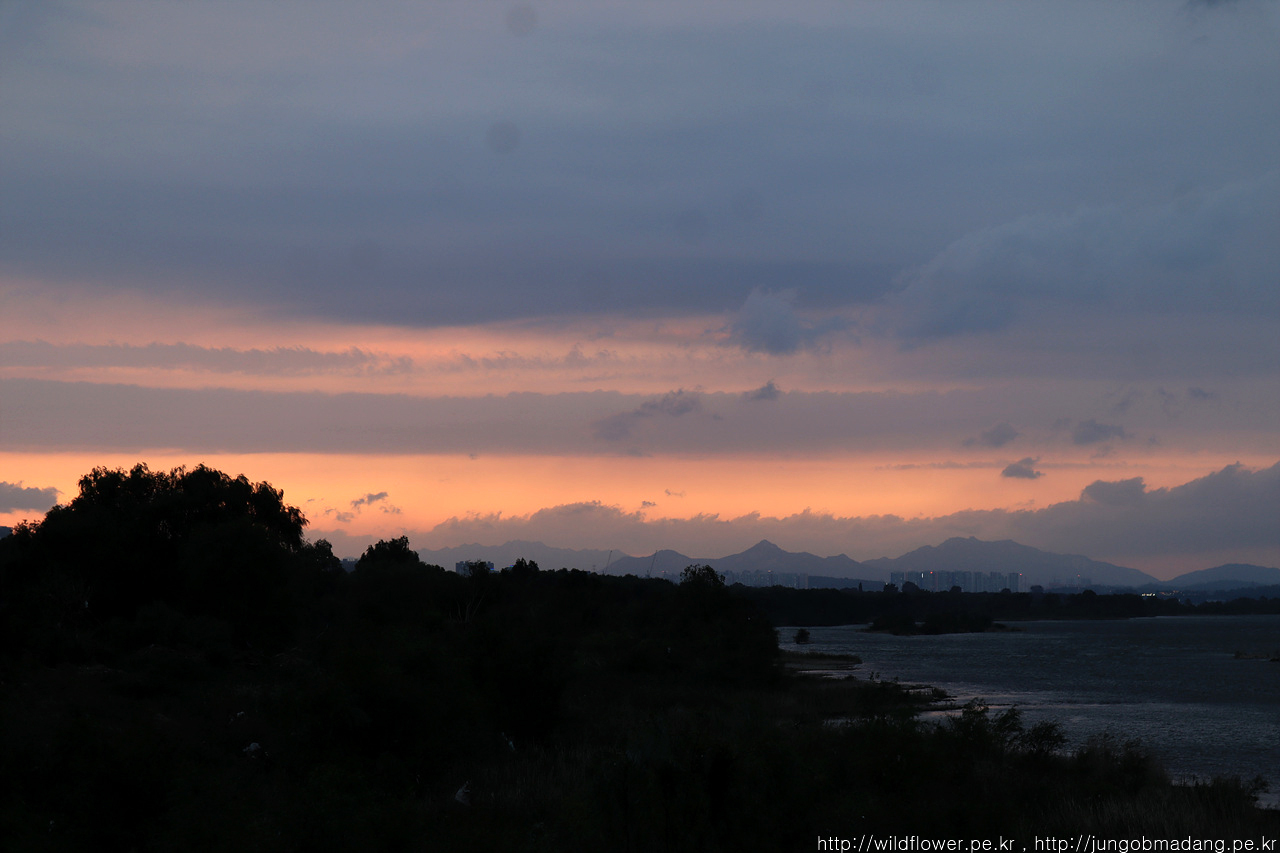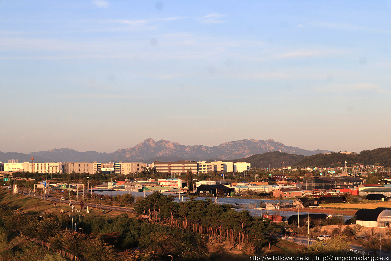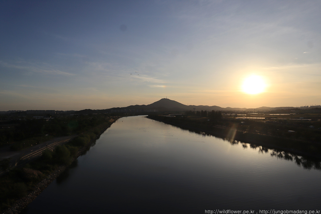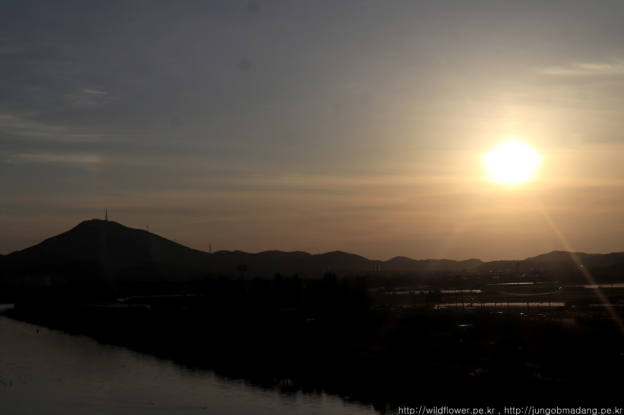 반대편으로는 햇님이 지고 있습니다. 봉긋이 나온 산은 인천광역시의 진산인 계양산입니다.