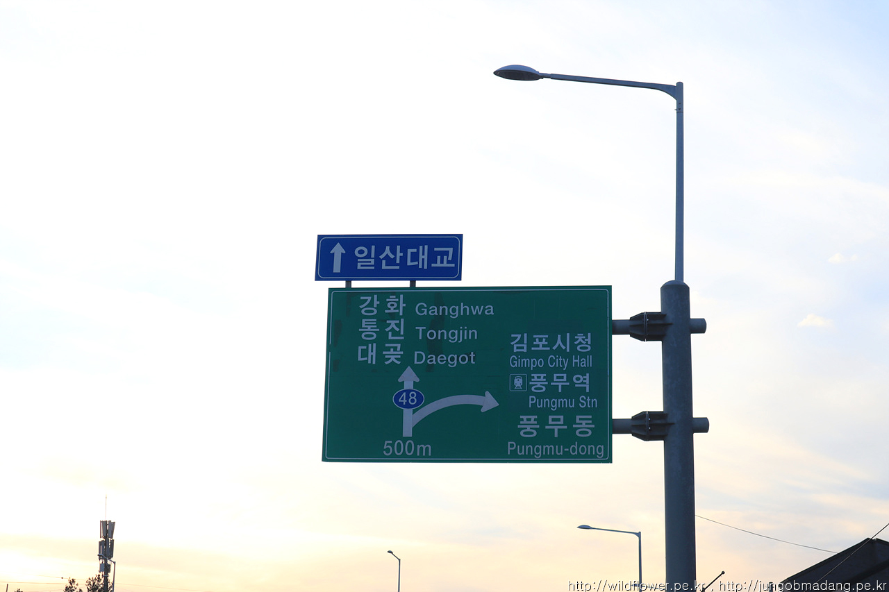 일산대교 이정표가 보입니다. 카카오맵을 통해 자전거가 가능한 길에 대해서 육안으로 자전거가 안전하게 갈 수 있는 길을 식별해서 가고 있습니다.