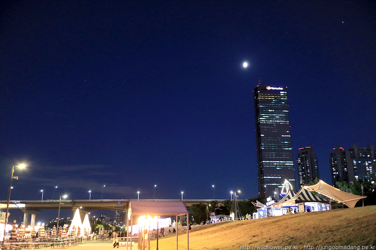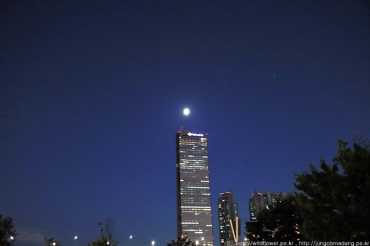 한화 빌딩 위로 잘 표현은 안되지만 반달보다 살짝 더 불룩한 달님이 보입니다. 삼각대는 챙겼으나 장거리임을 감안해 가급적 꼭 필요할때만 꺼내고 ISO 올려서 담아볼 생각입니다.