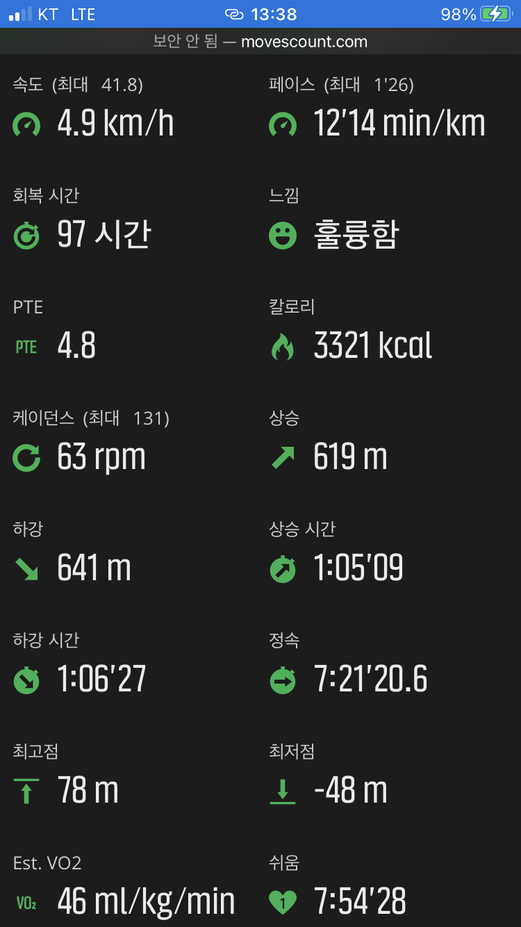> 순토 스파르탄에서 기록한 내용입니다. PTE가 4.8이면 최대치가 5.0에 감안하면 대단히 쎈 강도의 운동입니다. 회복 시간이 97시간이라는 데 그럼 4일동안 꼼짝마라인가요? ㅋㅋㅋ 에이 설마~