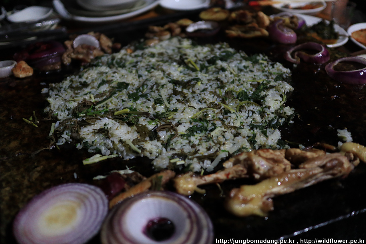 민박집에 도착하여 사장님이 준비해주신 직접 잡은 오리와 닭 구이를 준비합니다.