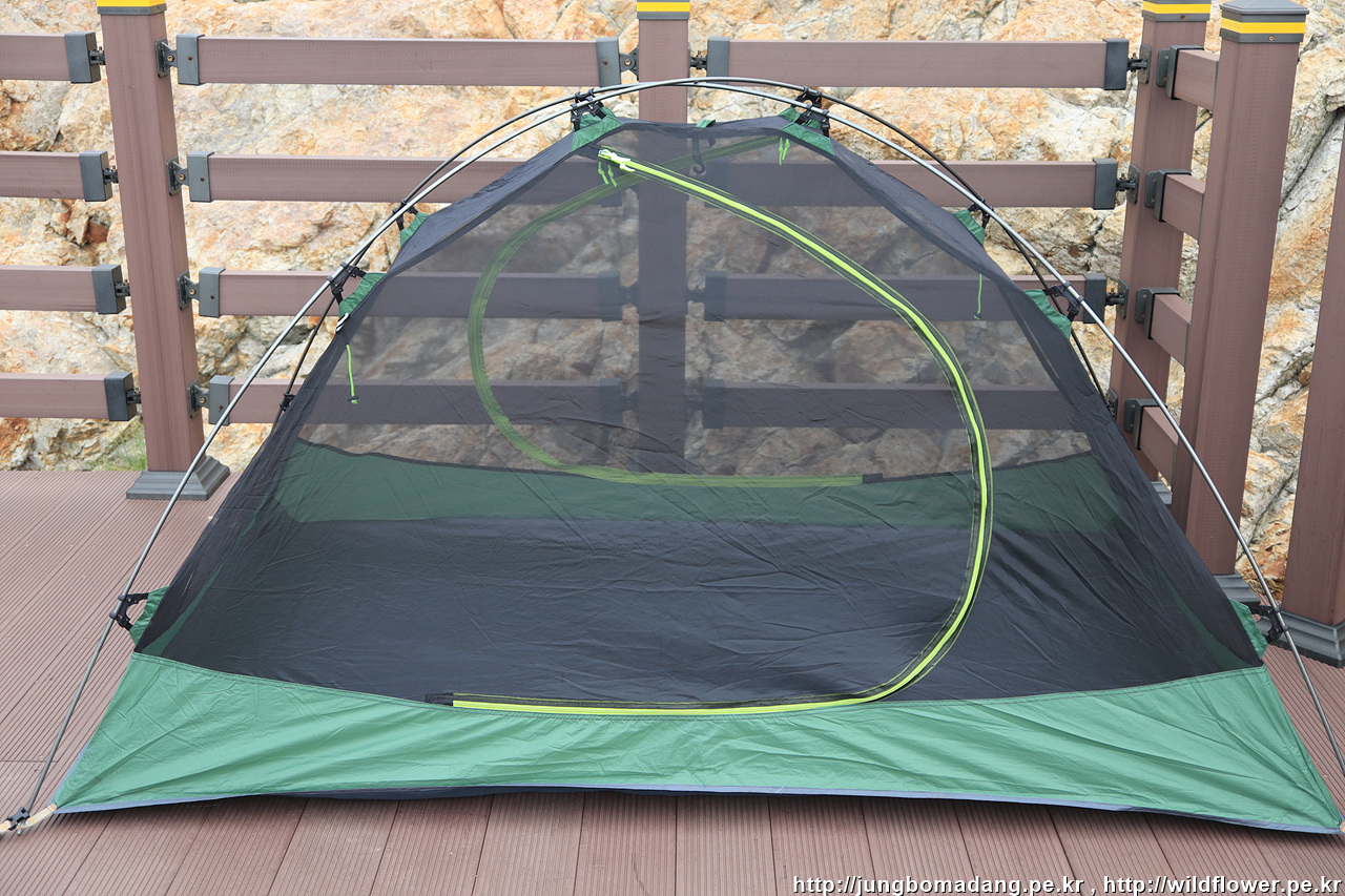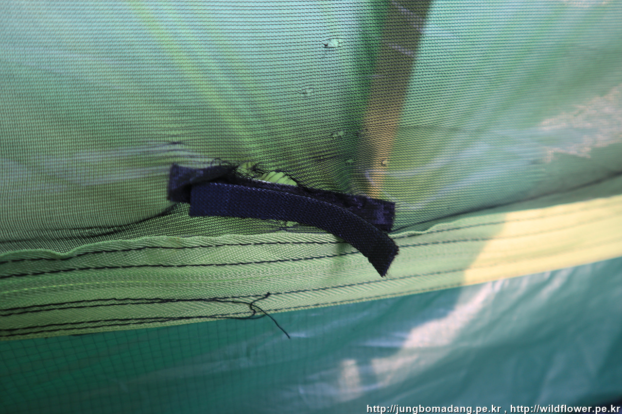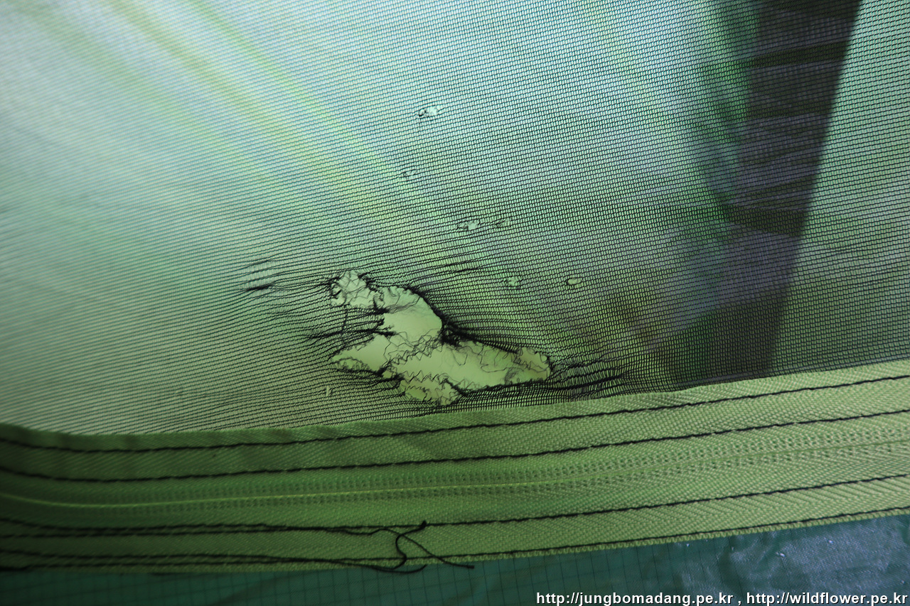 다행히 윗편에 숨겨진(?) 정자(신대산전망대)이 보여서 부랴 부랴 텐트를 옮기려고 설치한 곳으로 내려갔는 데, 웬 고냉이 한마리가 텐트 안쪽에서 나옵니다. 젠장... 텐트 안쪽에 음식을 놔두고 올라갔다 왔는 데, 방금 도망친 고냉이가 족발을 먹겠다고 텐트 매쉬를 이래 만들어 놨습니다 ㅠㅠ