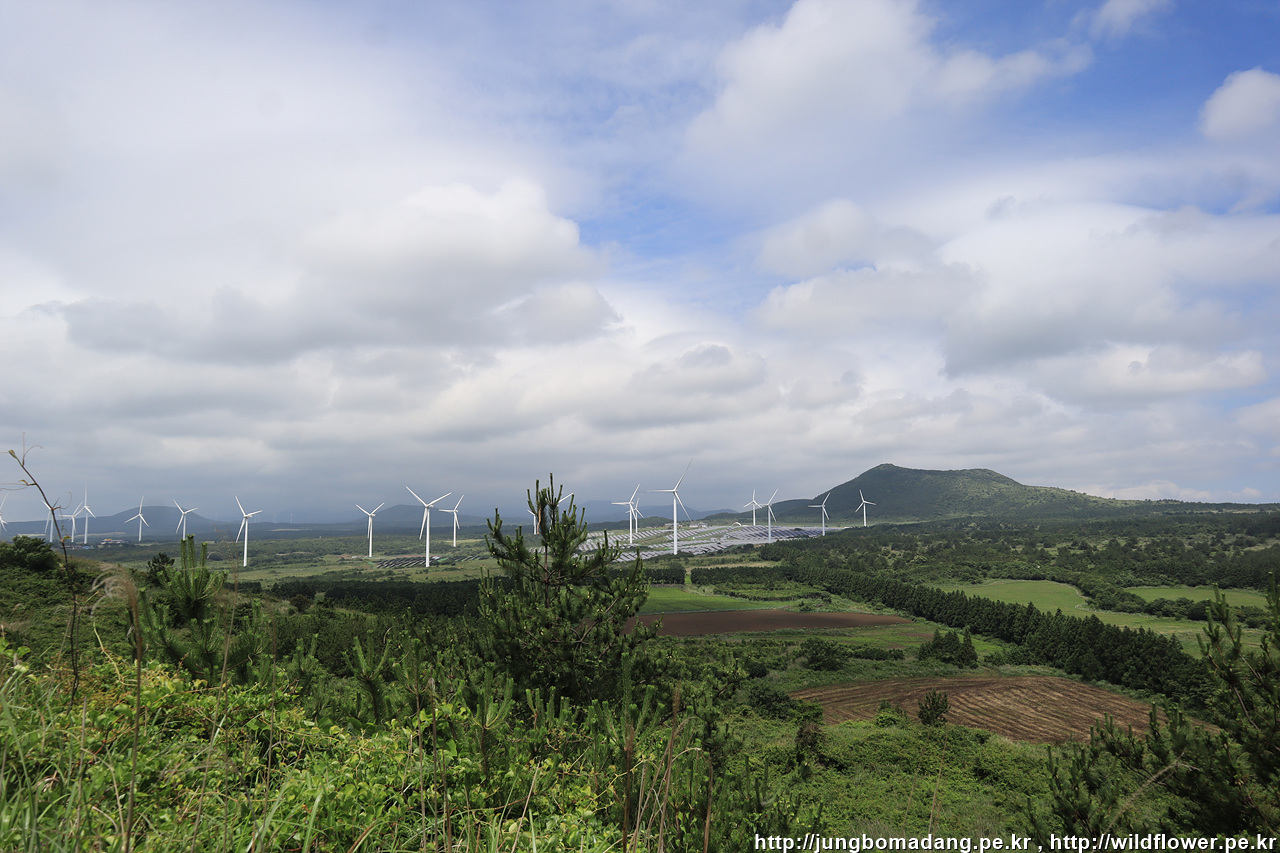 앞으로 가야할 방향을 봅니다. 풍력발전기 뒤로 대록산(큰사슴이오름)이 보입니다.