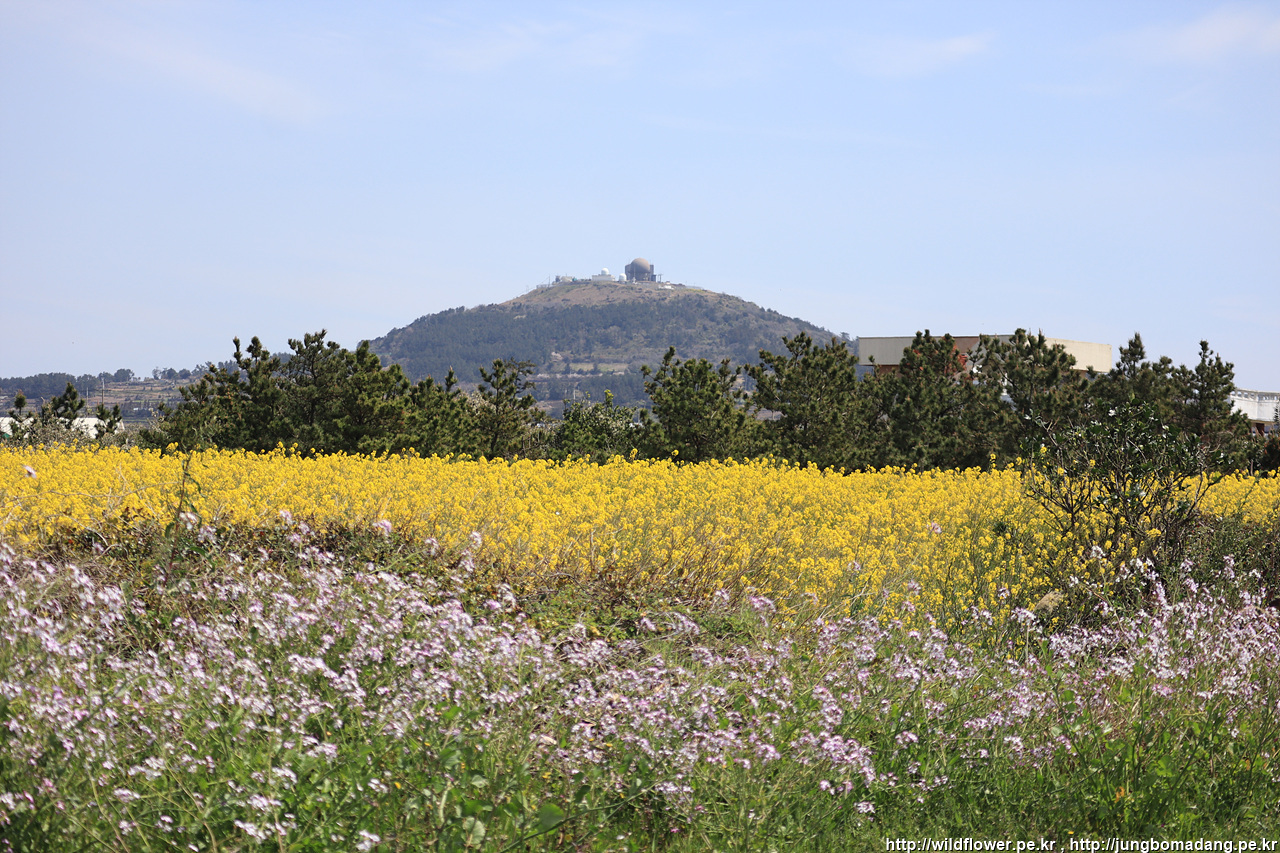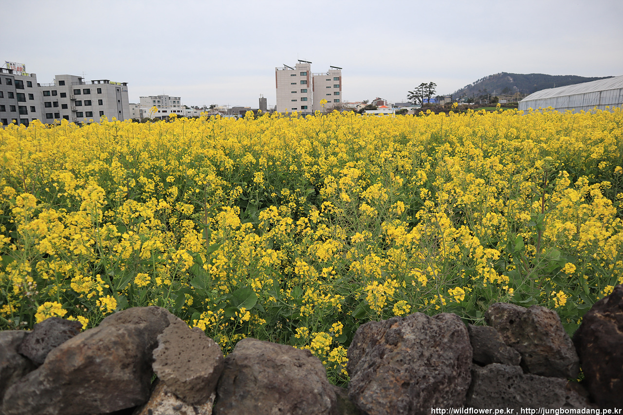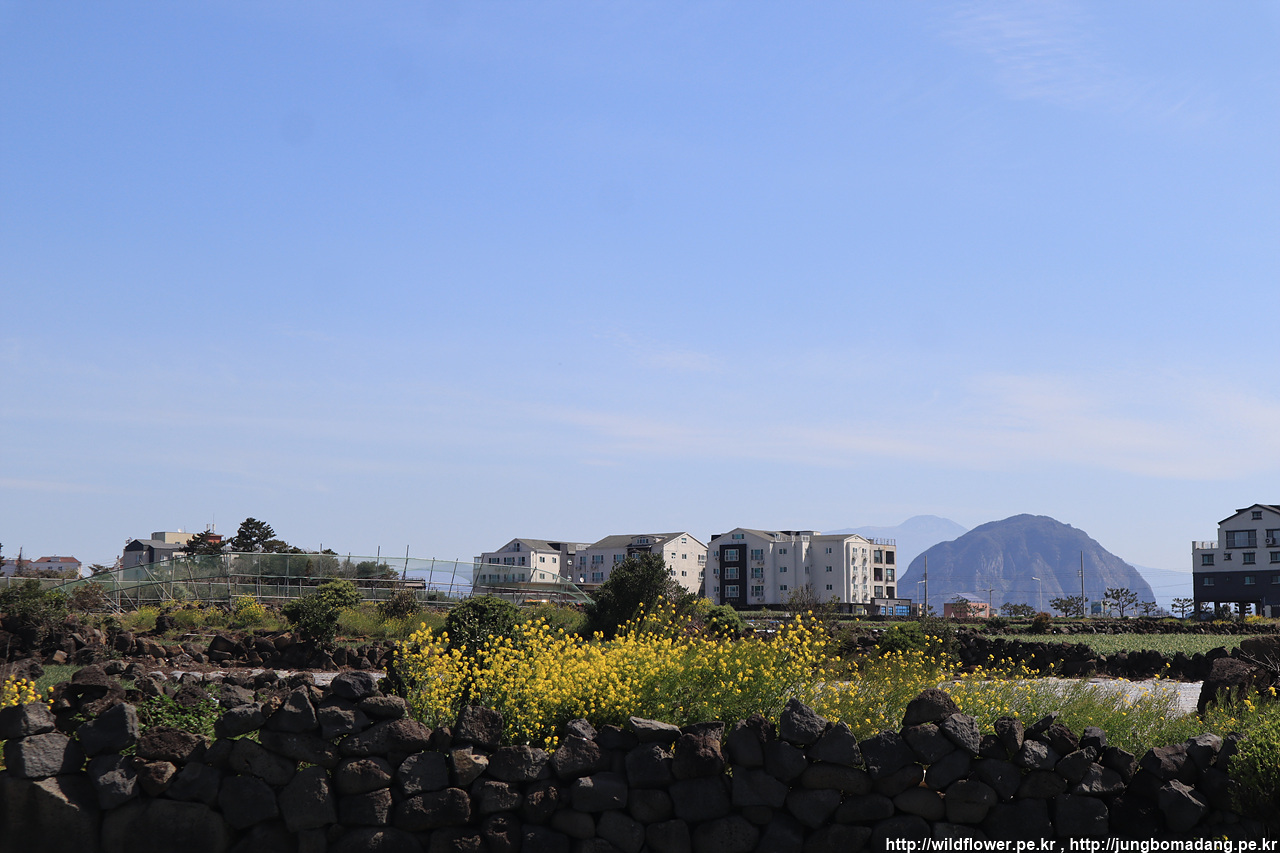 유채 그리고 건물 사이로 뿅 나온 산방산, 그리고 건물과 산방산 사이로 빼꼼하게 나온 한라산
