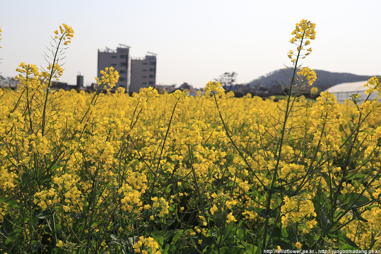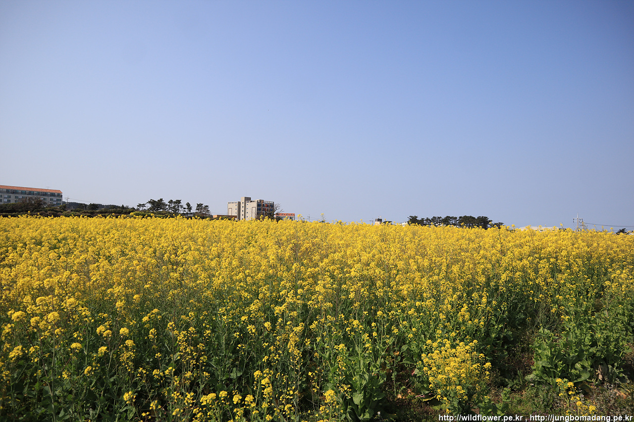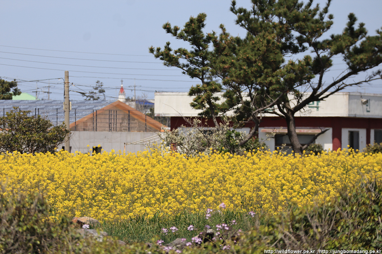 유채 그리고 건물 사이로 뿅 나온 산방산, 그리고 건물과 산방산 사이로 빼꼼하게 나온 한라산