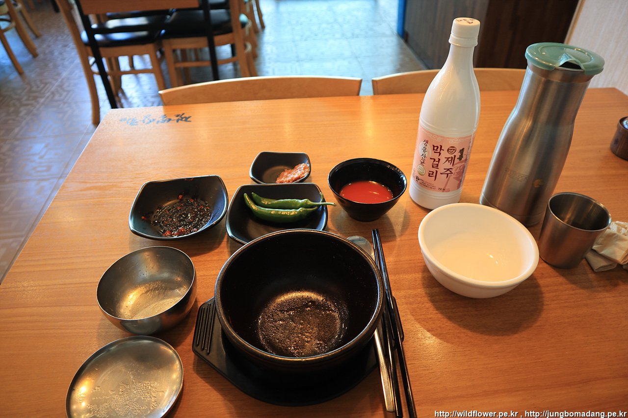 전복뚝배기에 막걸리 주문 여기도 깍두기가 일품!