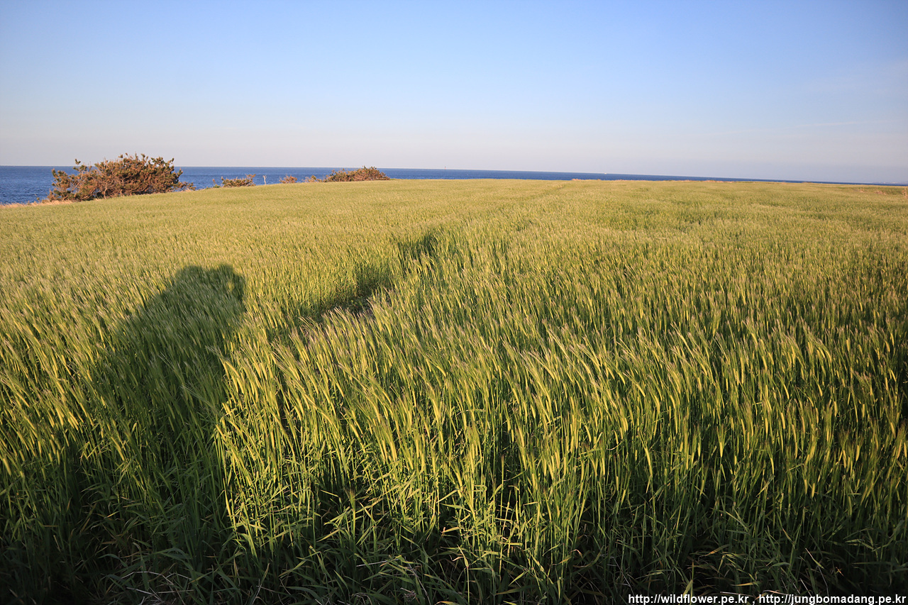 짐 정리를 마치고, 배낭을 메고, 일출의 감동이 아직 가시지 않았는 데, 아직 한시간정도 여유가 있어 보여서 청보리밭을 다시 경유해 봅니다.