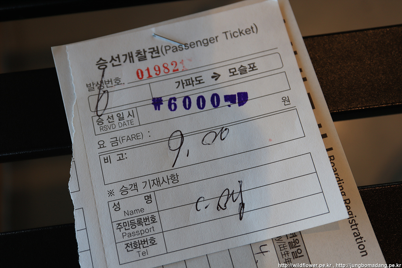 왕복 13100원, 모슬포(운진항) -> 가파도 : 7100원, 가파도->모슬포(운진항) 6000원. 전 일박 한다니까 가파도행 편도만 끊고 내일 나올때 별도로 매표를 하라고 합니다. 근데 중요한 건 나올때는 현금으로 계산해야 한다는 점입니다.