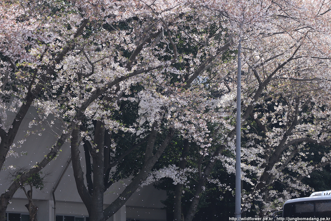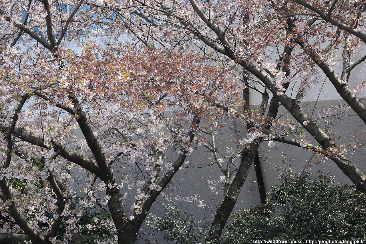 벚나무 꽃잎이 바람에 떨어집니다.