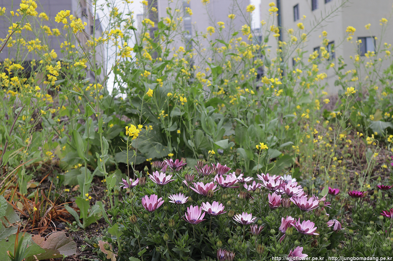 멀리 노란색은 유채, 유채 아래 노란건 유래옵스, 유리옵스 아래는 팬지