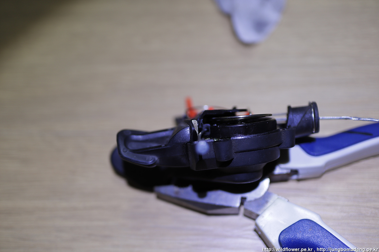 새로운 기어 속선을 고체시 우측편으로 90도 꺽여서 빼내야하는 데, 잘 안될경우 끝 부분을 약간 구부려서 하면 도움이 됩니다.