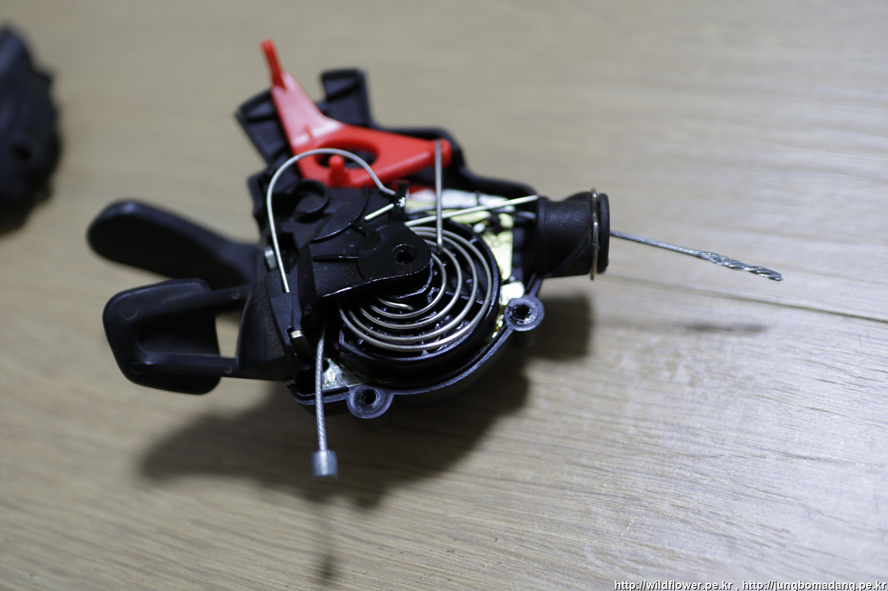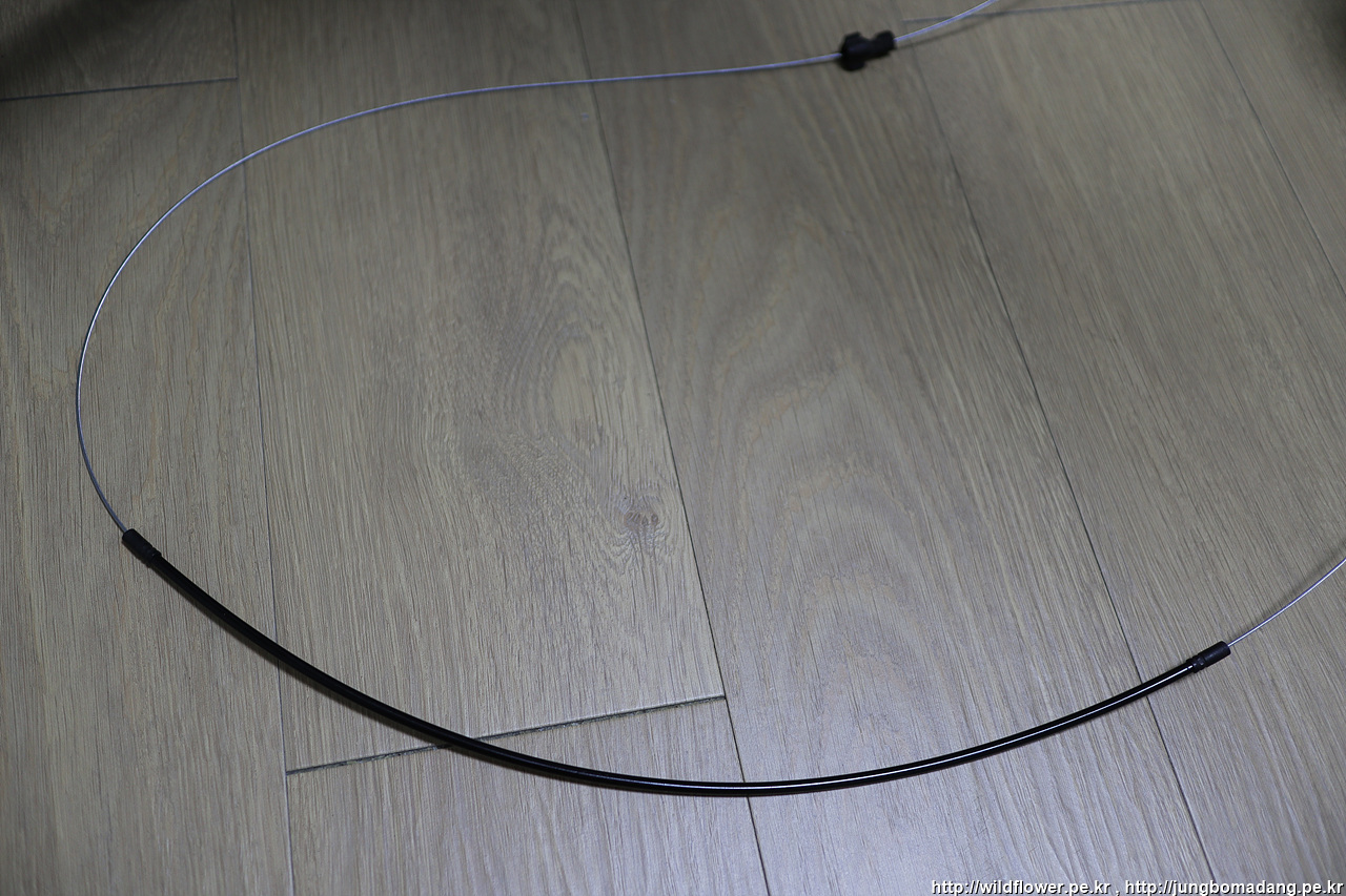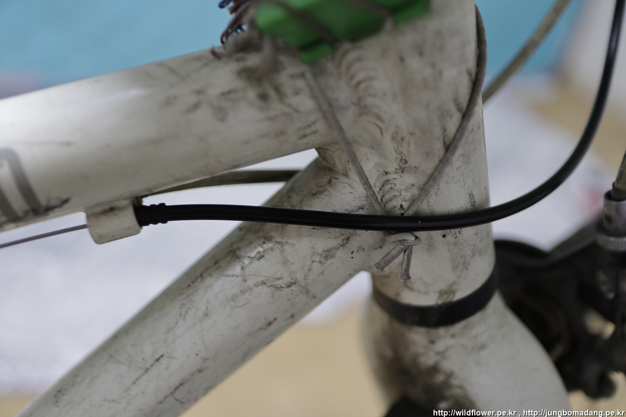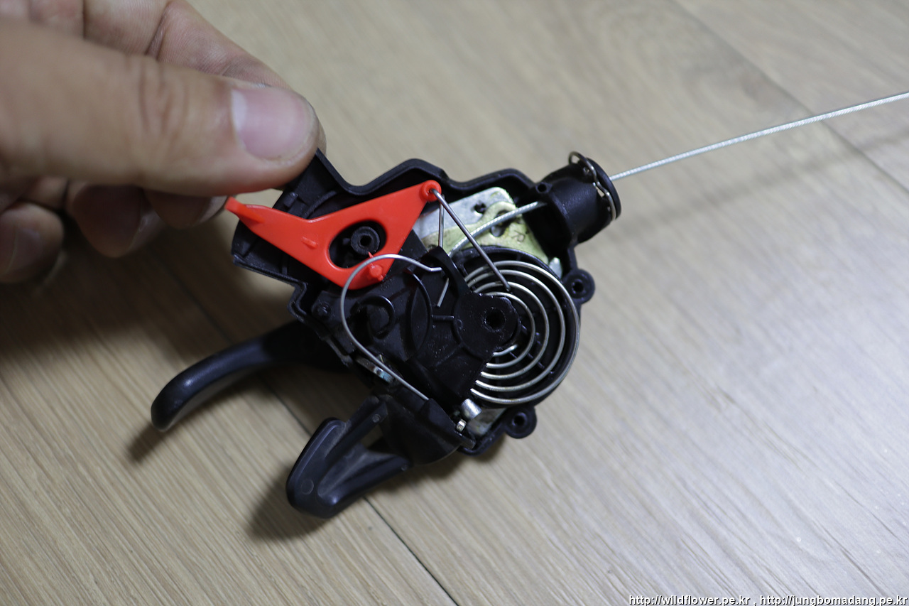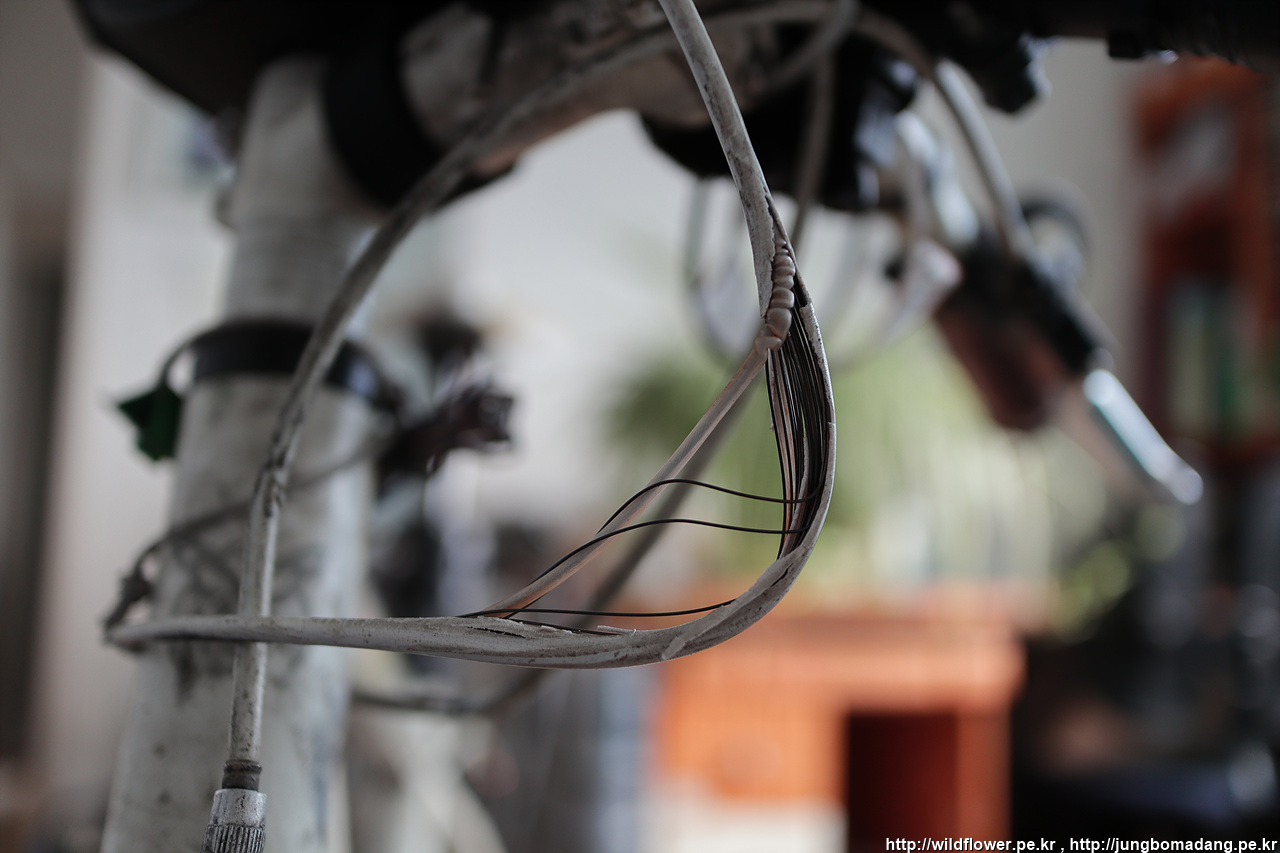 며칠 있다가 확인하니 보다시피 선이 파손되었습니다. 그냥 열심히 타고만 다녔는 데, 기어 레버에 선이 속선이 있고 그 위로 여러 구조로 겹쳐있는 겉선이 있었던 것입니다. 그런데 속선을 감싸던 겉선이 파손되는 바람에 속선이 겉선을 타고 뒷바퀴로 변속기에 힘이 전달이 안되는 거였습니다.