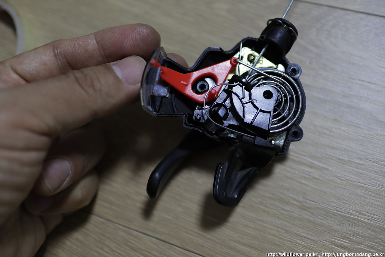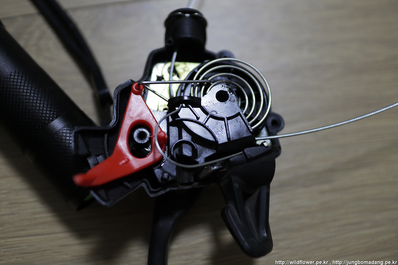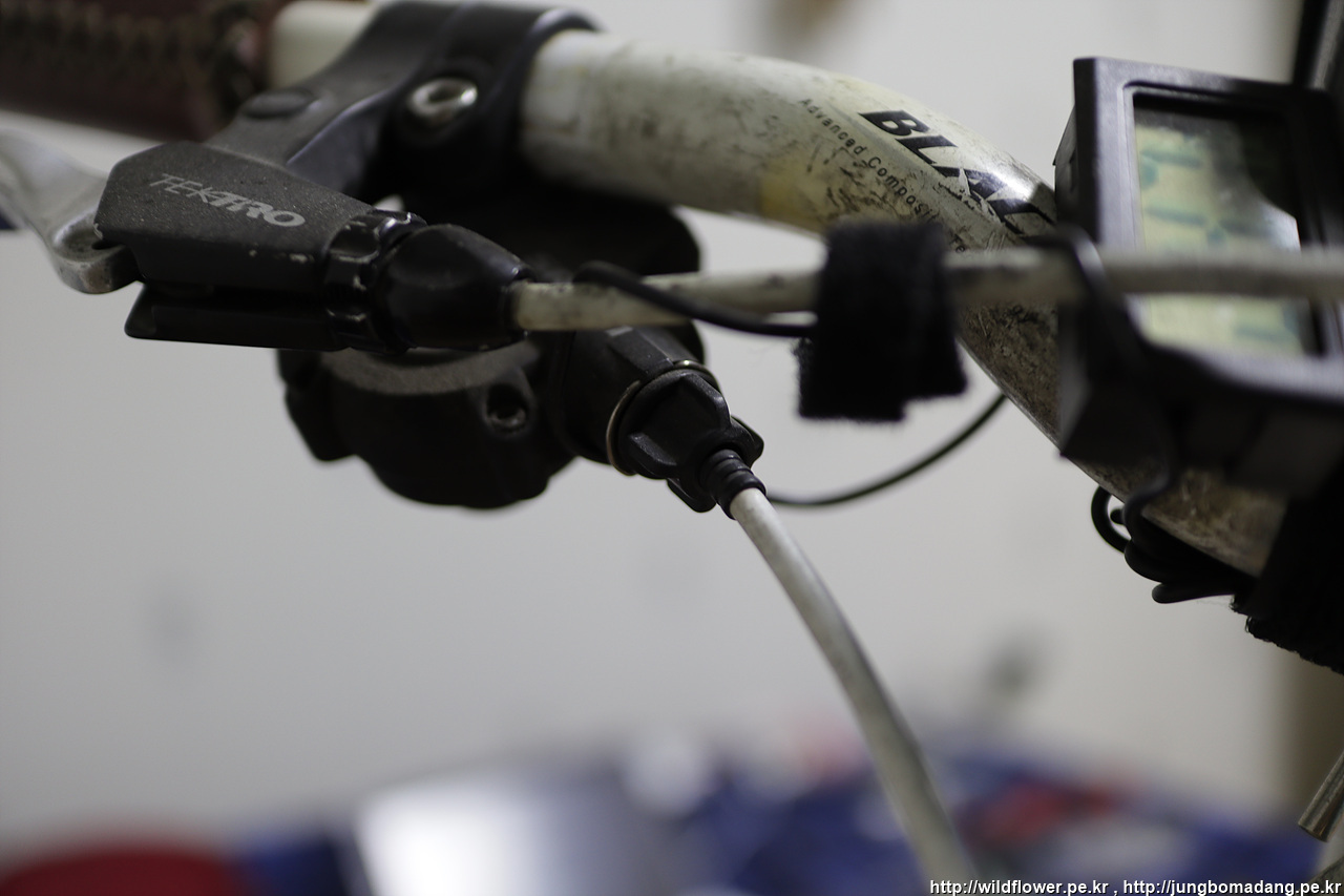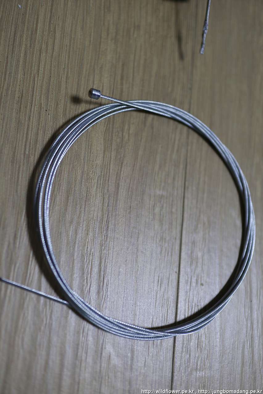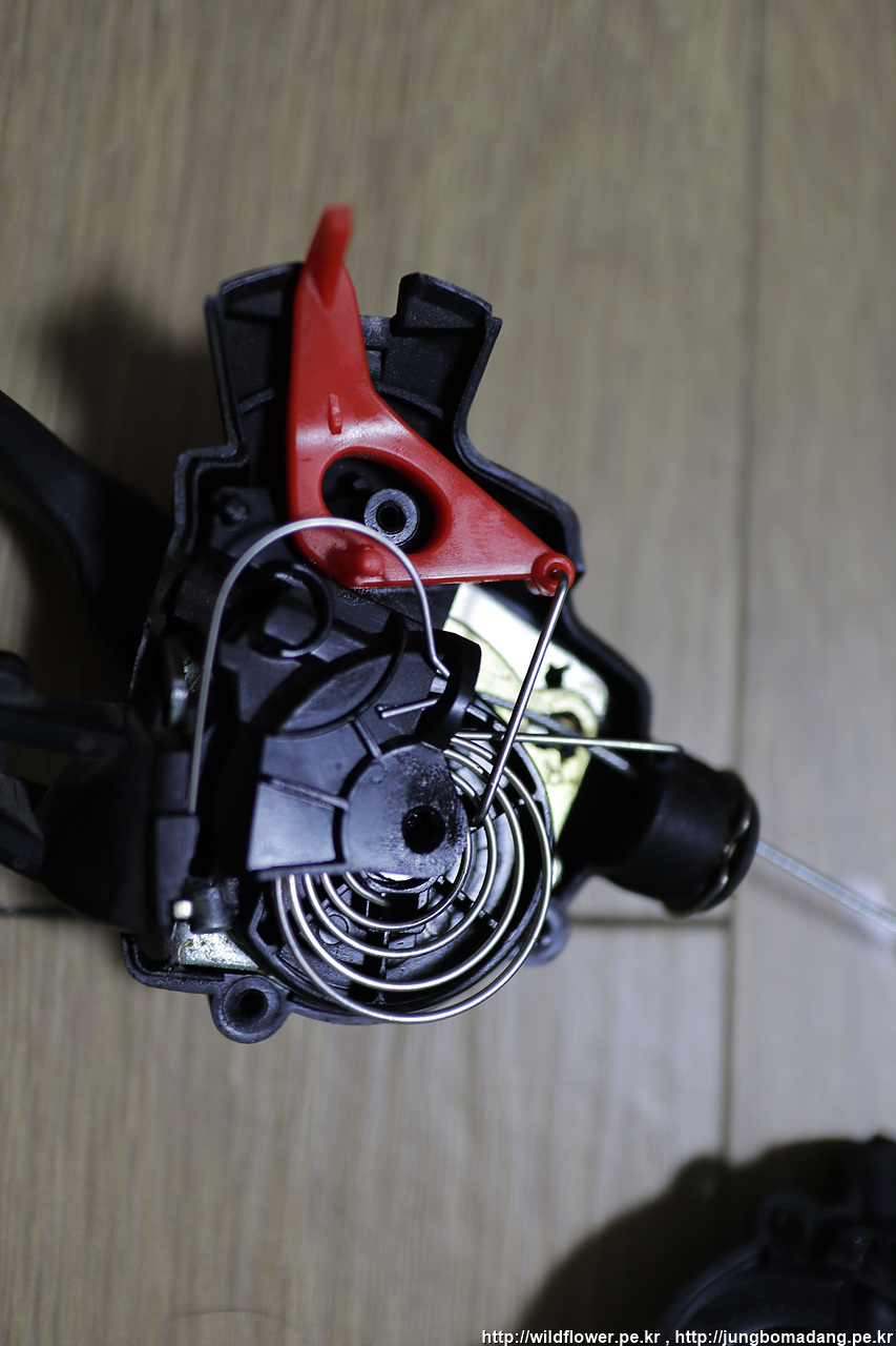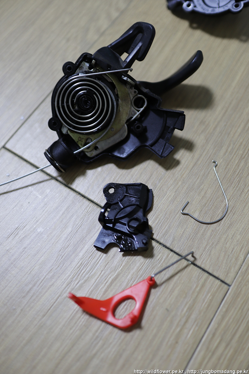 며칠 있다가 확인하니 보다시피 선이 파손되었습니다. 그냥 열심히 타고만 다녔는 데, 기어 레버에 선이 속선이 있고 그 위로 여러 구조로 겹쳐있는 겉선이 있었던 것입니다. 그런데 속선을 감싸던 겉선이 파손되는 바람에 속선이 겉선을 타고 뒷바퀴로 변속기에 힘이 전달이 안되는 거였습니다.