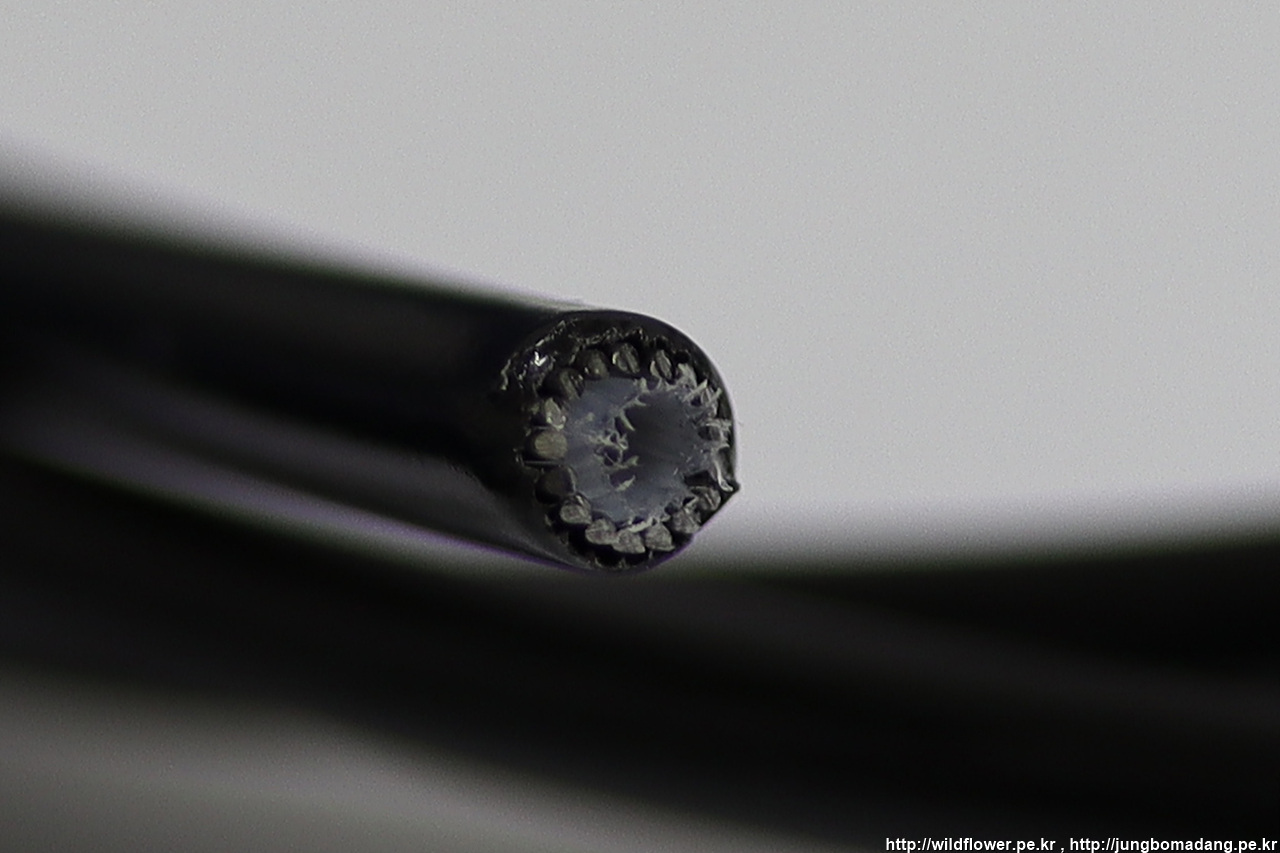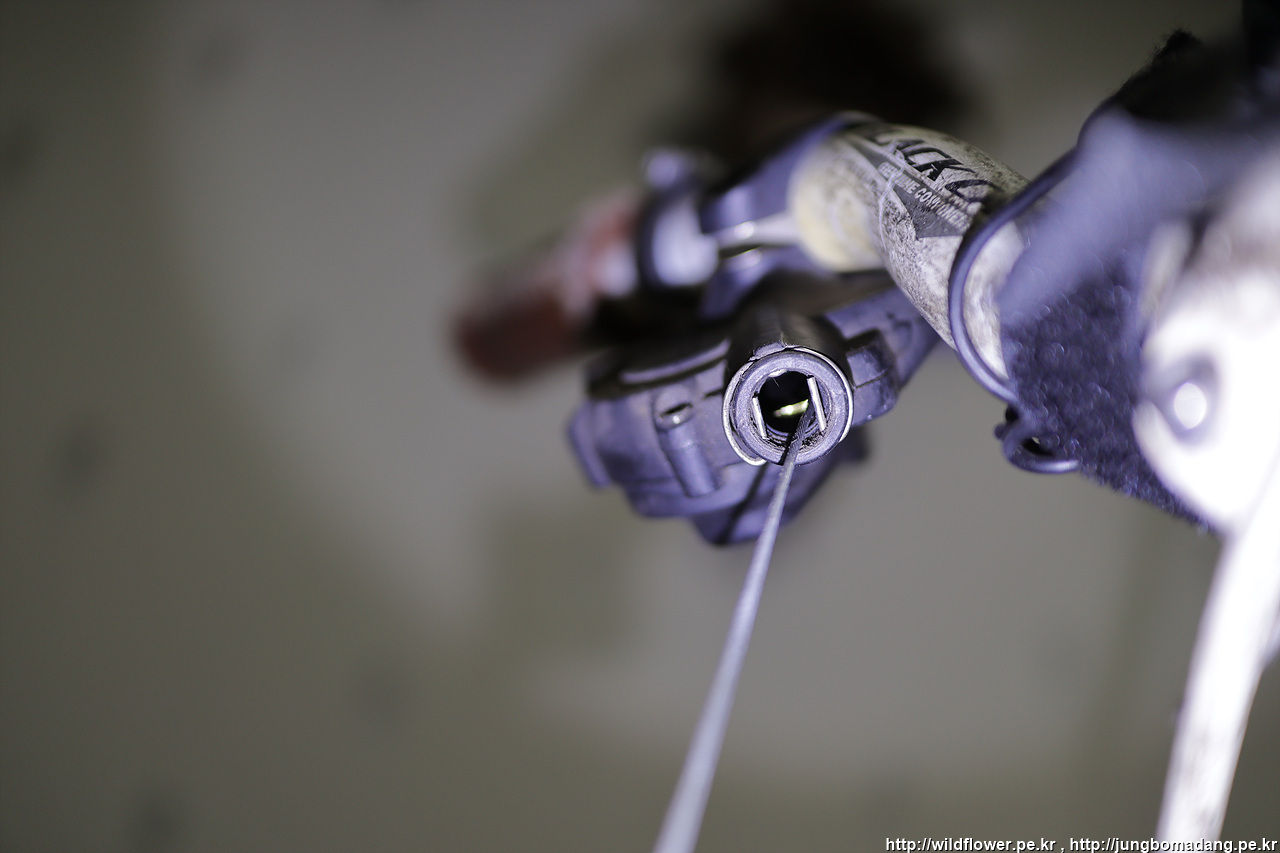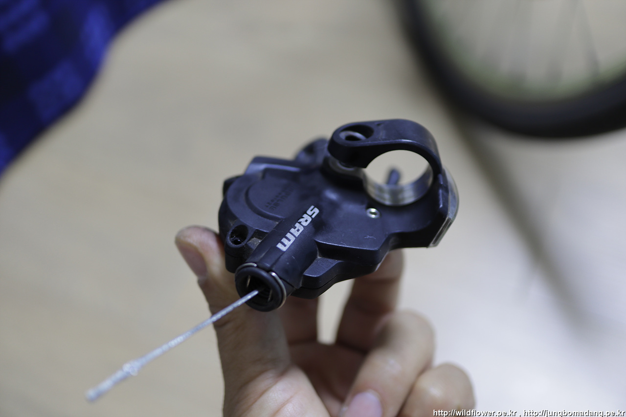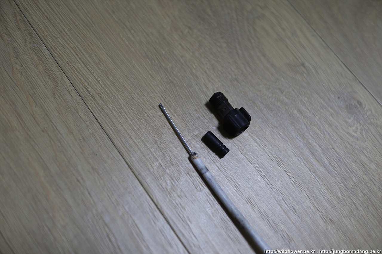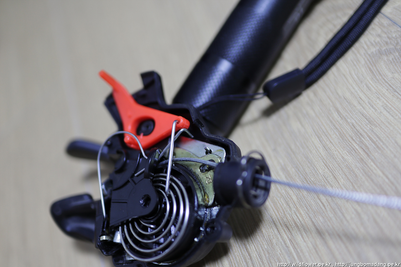 며칠 있다가 확인하니 보다시피 선이 파손되었습니다. 그냥 열심히 타고만 다녔는 데, 기어 레버에 선이 속선이 있고 그 위로 여러 구조로 겹쳐있는 겉선이 있었던 것입니다. 그런데 속선을 감싸던 겉선이 파손되는 바람에 속선이 겉선을 타고 뒷바퀴로 변속기에 힘이 전달이 안되는 거였습니다.