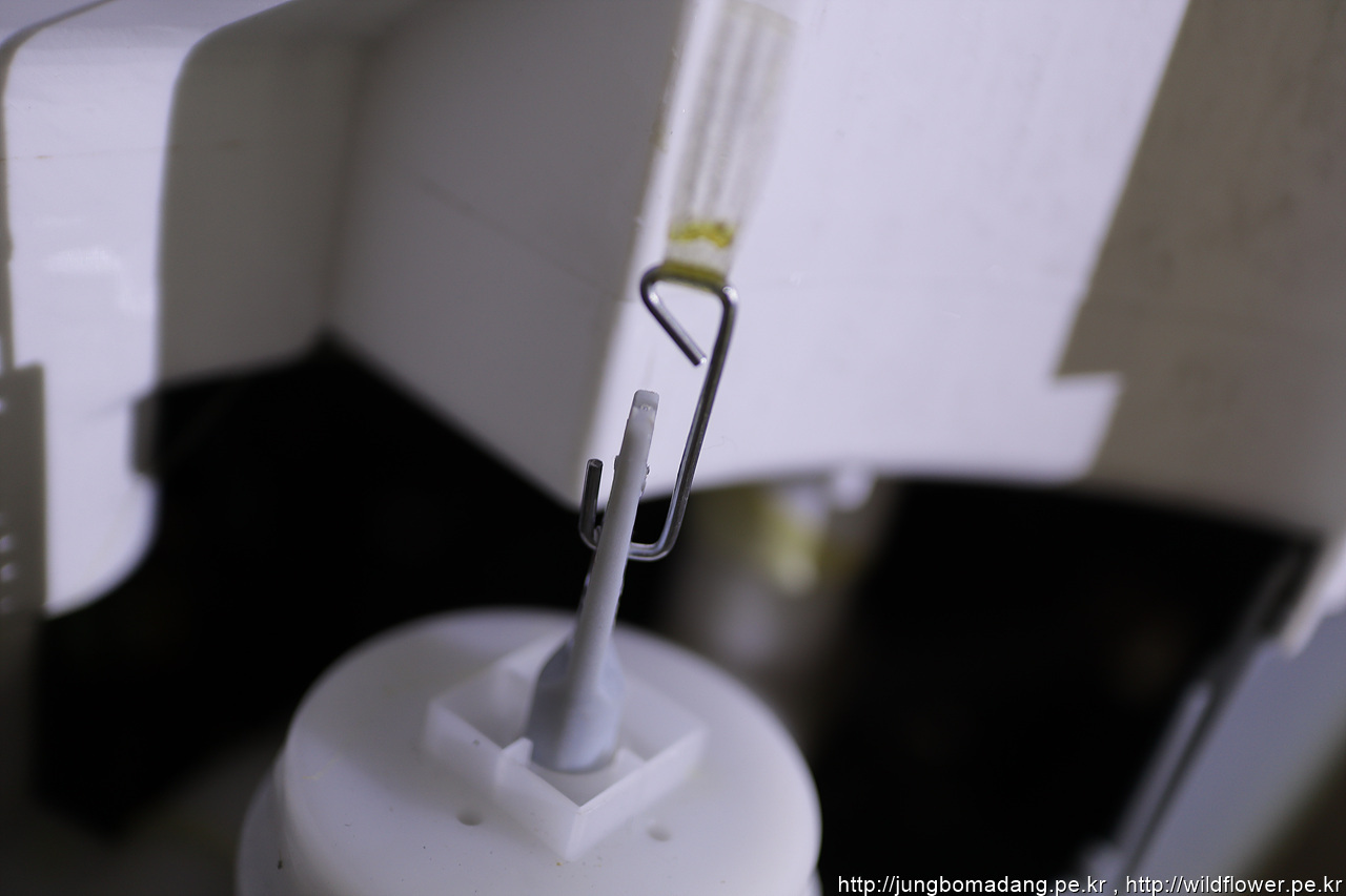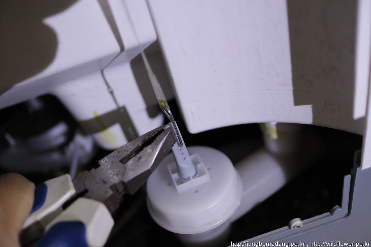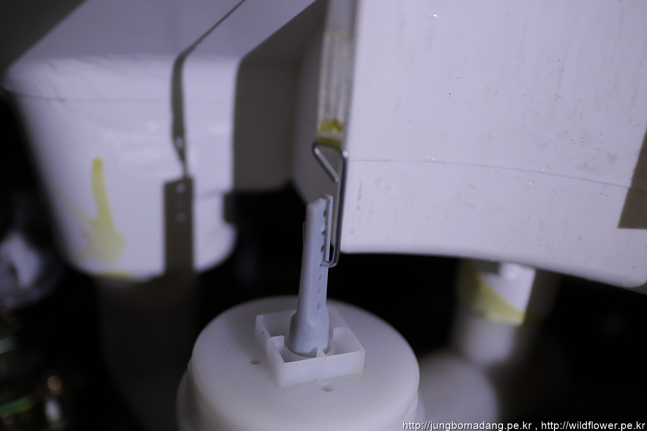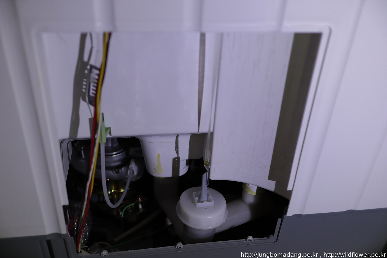 하지만, 본능적으로 본체 상단의 다이얼부에 연결된 긴 선과 그 아래 클립 그리고 그 아래 뭔가 관이 있는 구조로 이 부분에 먼가 열쇠가 있는 거라 생각합니다. 클립이 연결된 배수 조절 부속에는 구멍이 세로방향으로 여러개 뚫려 있는 데, 선택모드 다이얼을 배수로 변경하니 이 부속이 살짝 들립니다. 근데 물은 덜 빠져서 펜치를 가져 와서 임의로 이 부속을 위로 슥 들어 올리니 물이 쏵~ 배수가 되는 거였습니다. 아하! 그렇구나