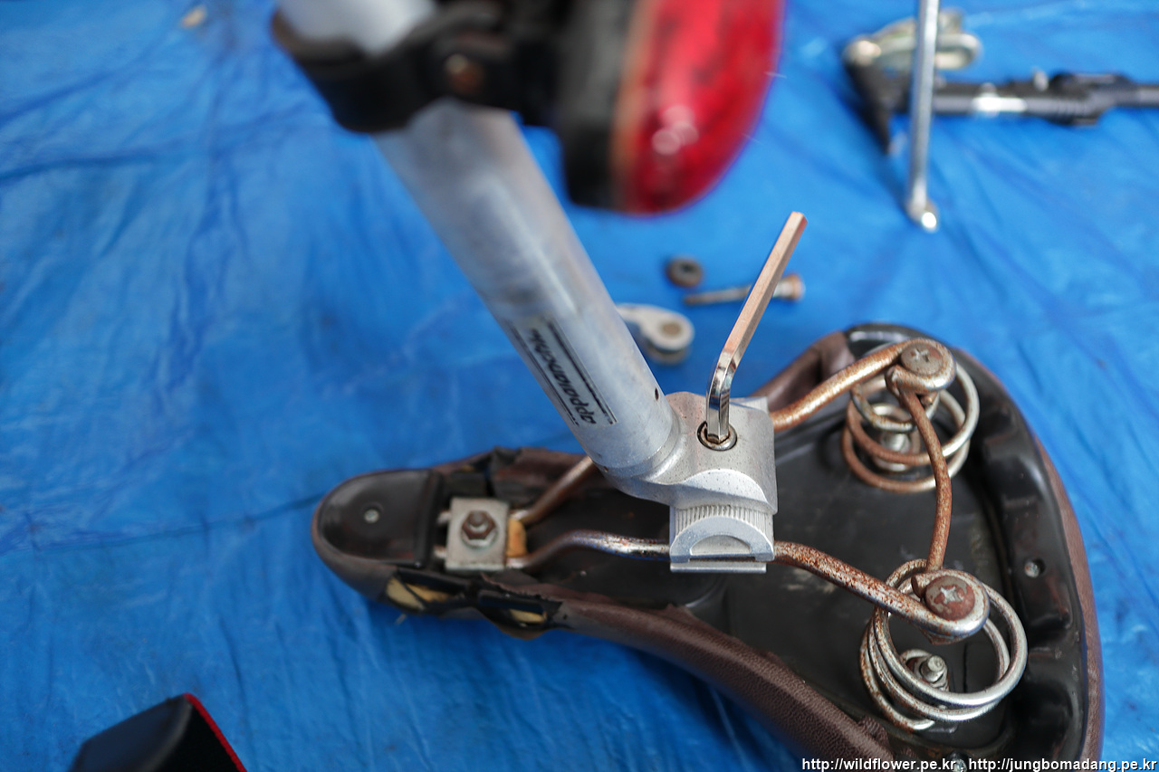 장착된 상태에서 분해가 불편해서 안장봉을 아예 빼고 작업하니 좀 수월하네요.