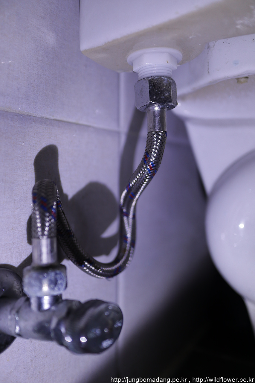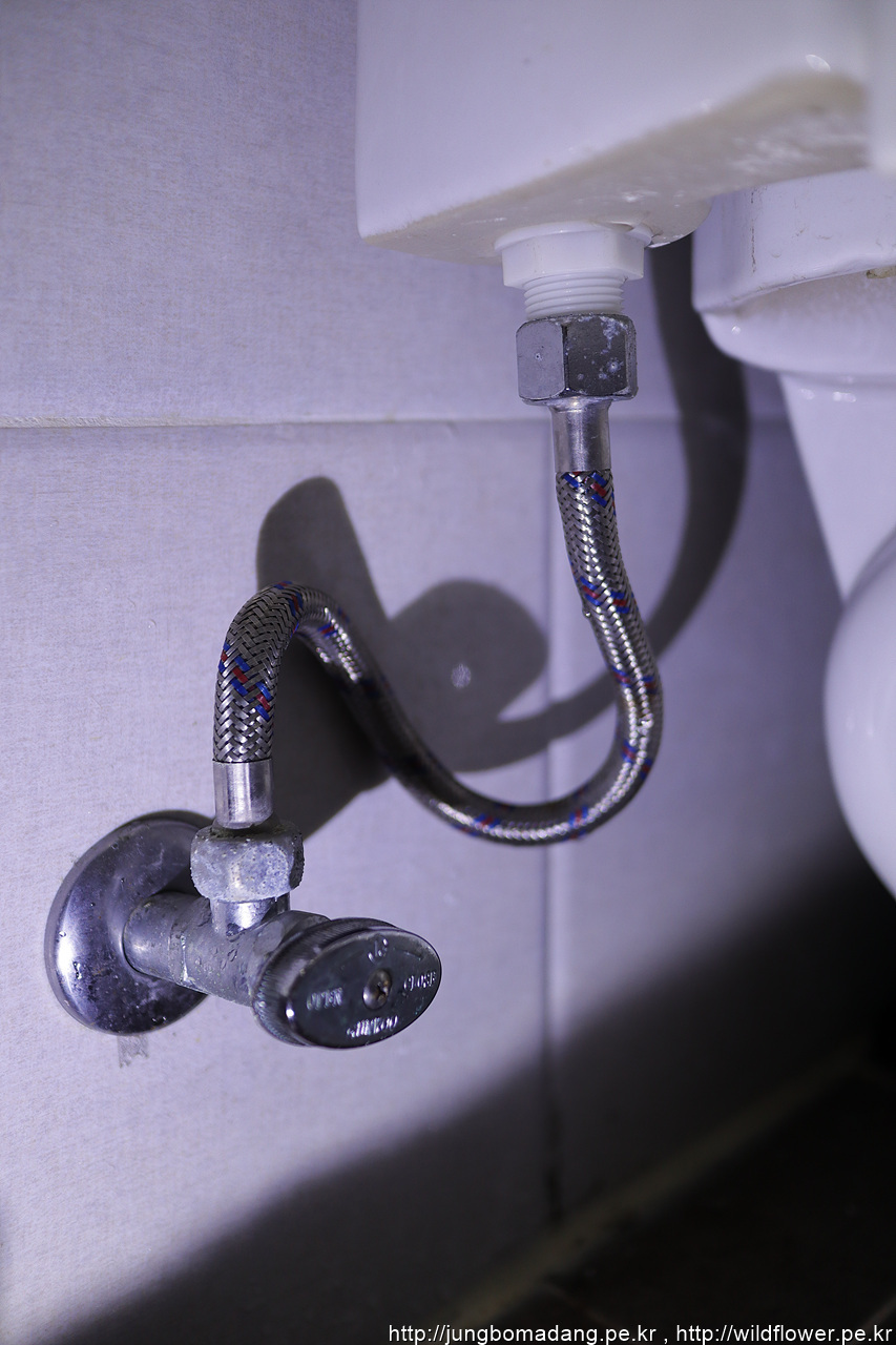 5년 정도 사용한 양변기인데 어느날 변기에서 물떨어지는 소리 들리길래 찾아보니 보다시피 필밸브의 양변기 체결된 아랫쪽(로크너트)에서 물이 새어 나옵니다.