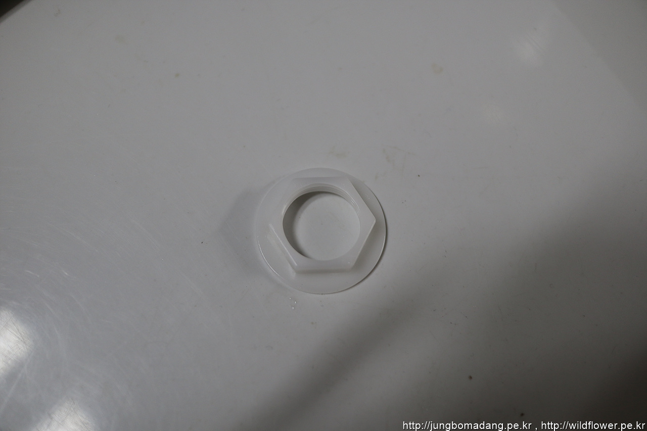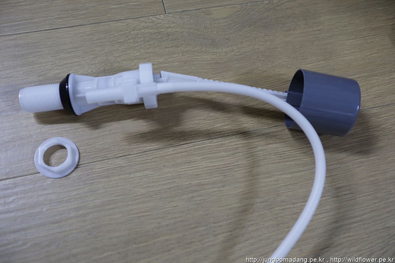 로크너트를 조입니다. 이때 부구가 핸들의 줄이나 물탱크 벽면에 붙지 않게 중간쯤으로 조정해서 로크너트를 조이고, 마지막으로 스패너로 조이는 데 너무 심하게 조일 필요를 없고 조이다 보면 끼기긱 패킹의 마찰음이 들릴때까지 조이면 됩니다(제 경우).
