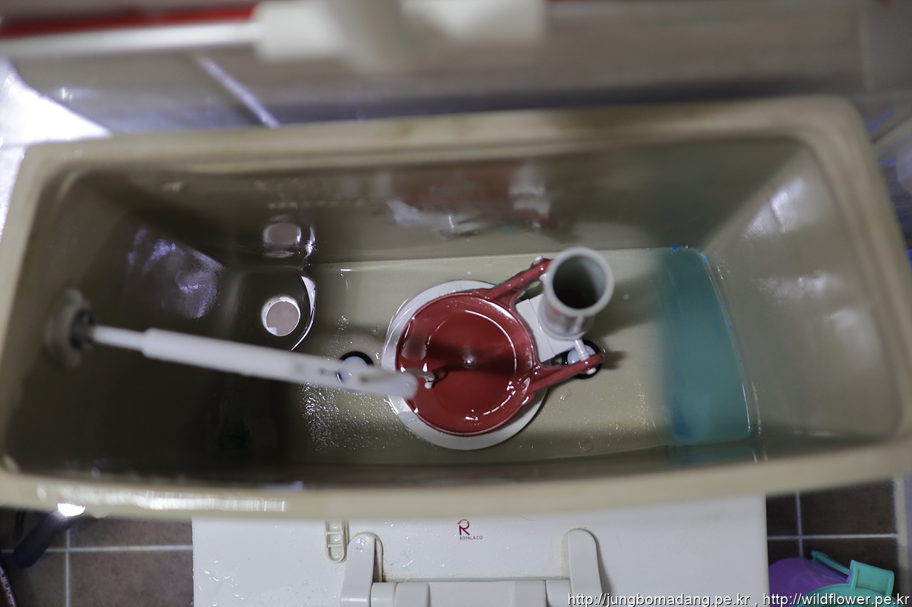 급수밸브를 개방해서 물을 받아 봅니다. 물이 오버플로우 관에 넘을정도로 받아 졌네요. 핸들을 내려 물을 빼고,
