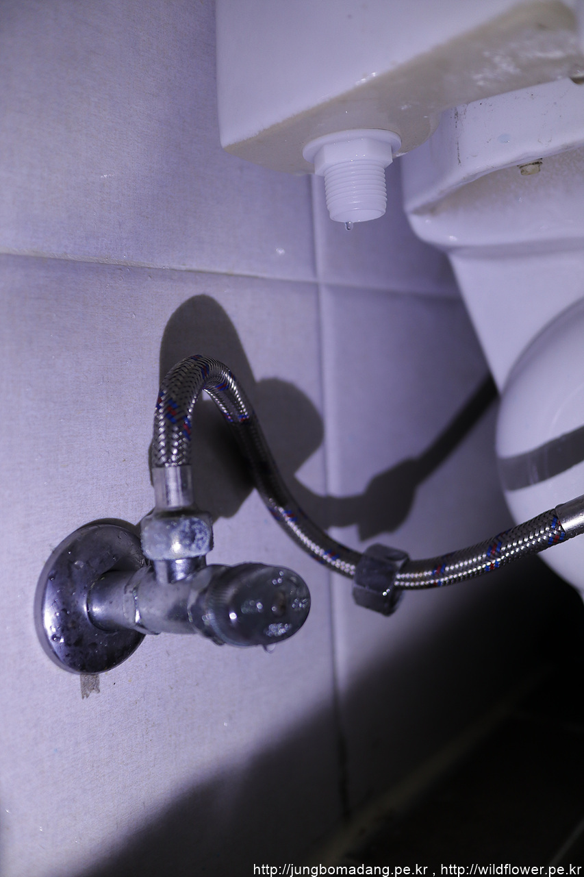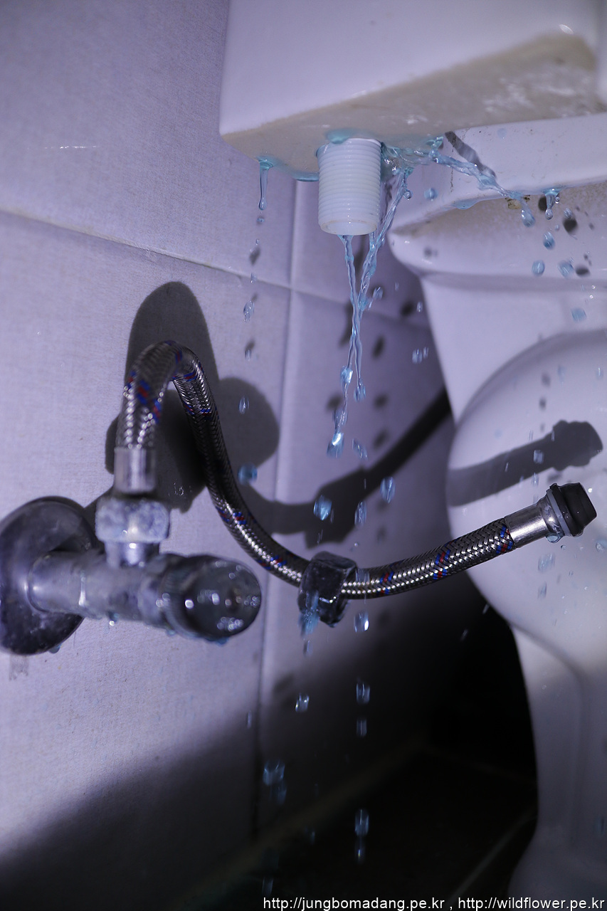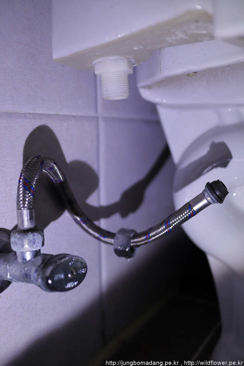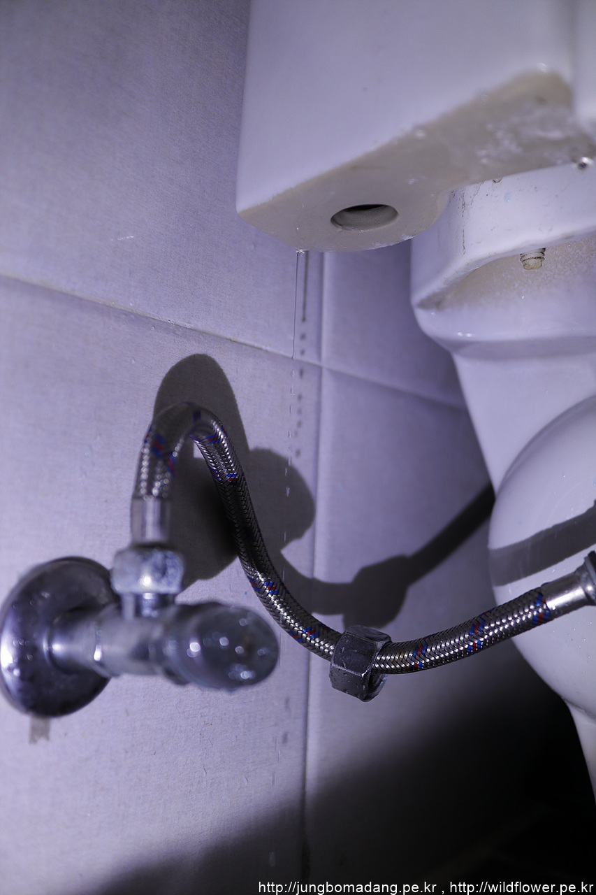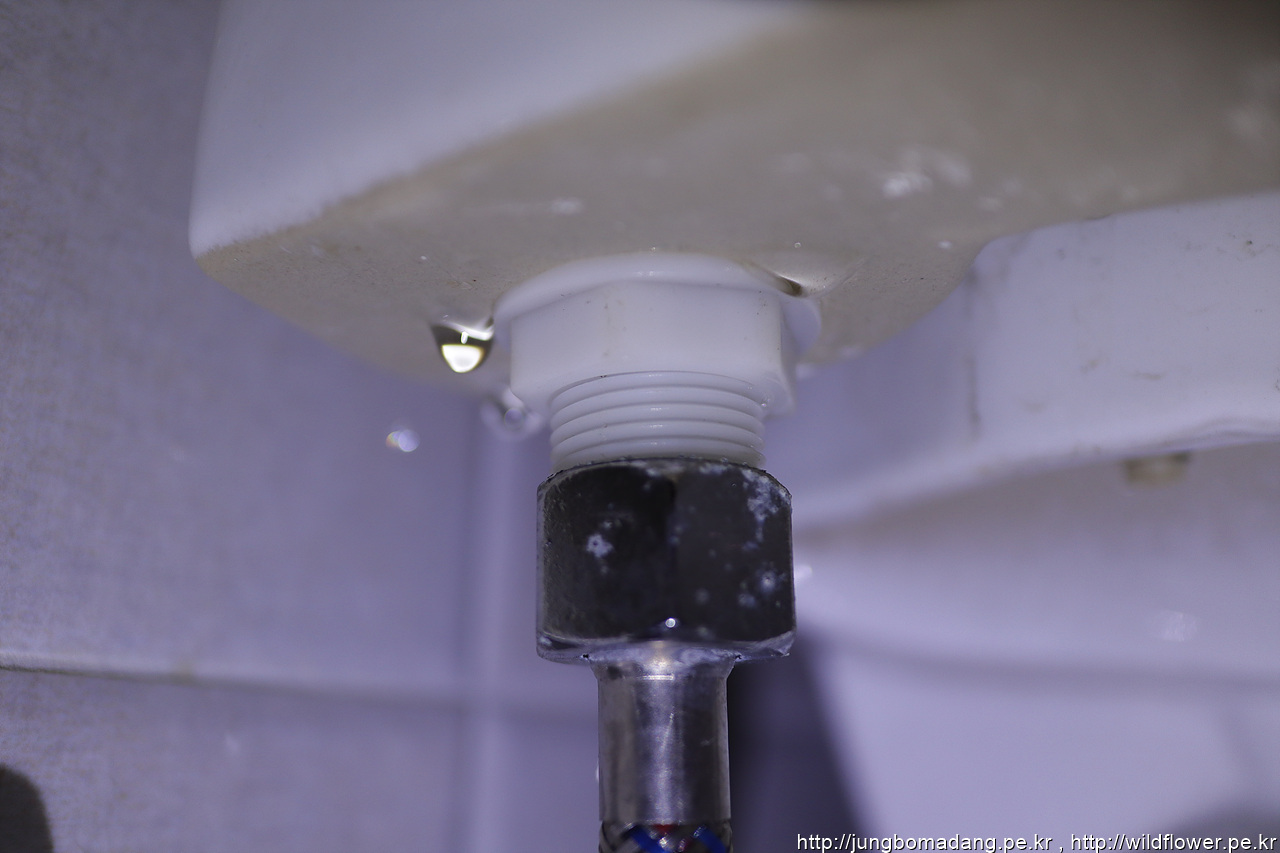 5년 정도 사용한 양변기인데 어느날 변기에서 물떨어지는 소리 들리길래 찾아보니 보다시피 필밸브의 양변기 체결된 아랫쪽(로크너트)에서 물이 새어 나옵니다.