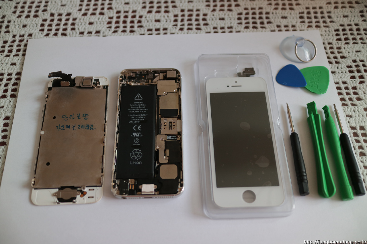 좌측이 불량 액정(상단에 카메라모듈, 가운데 백판넬, 하단에 홈버튼은 새로운 곳에 떼어 옮겨야 함), 가운데는 불량 액정이 떼어진 아이폰5, 우측은 수리할 새로 구입된 액정 및 수리 도구입니다.