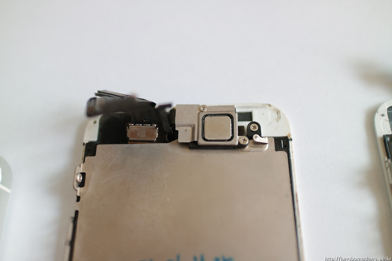 우선 카메라 모듈 쪽을 보호하고 있는 판넬을 떼어내면 가장 떼기 난해한 부분이 보이죠. 단자가 붙은 이 부분은 열을 가해서 떼어야 합니다.