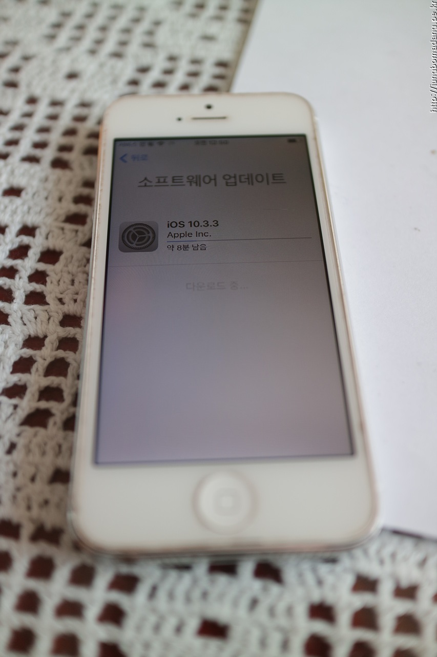 기존에 있던 지저분한 데이터를 모두 지우고(초기화) 이렇게 와이파이 잡아서 소프트웨어 업데이트도 합니다. 아쉽게도 아이폰5는 10.3.3이 마지막 업데이트지요.