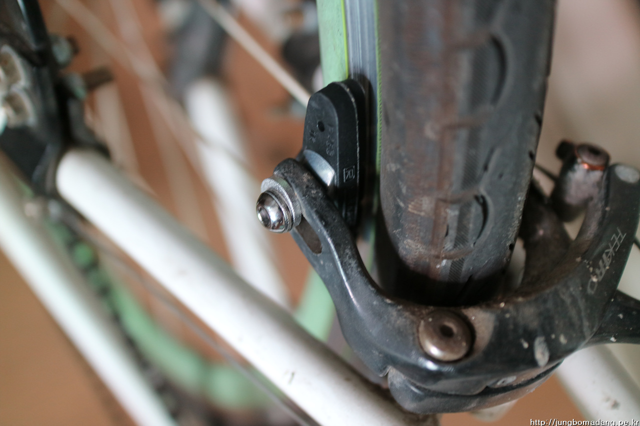 뒷바퀴도 브레이크 패드 교체 완료. 지름이 맞는 렌치만 있으면 교체가 쉽습니다. 타이어에 브레이크가 닿지 않게만 주의합니다.