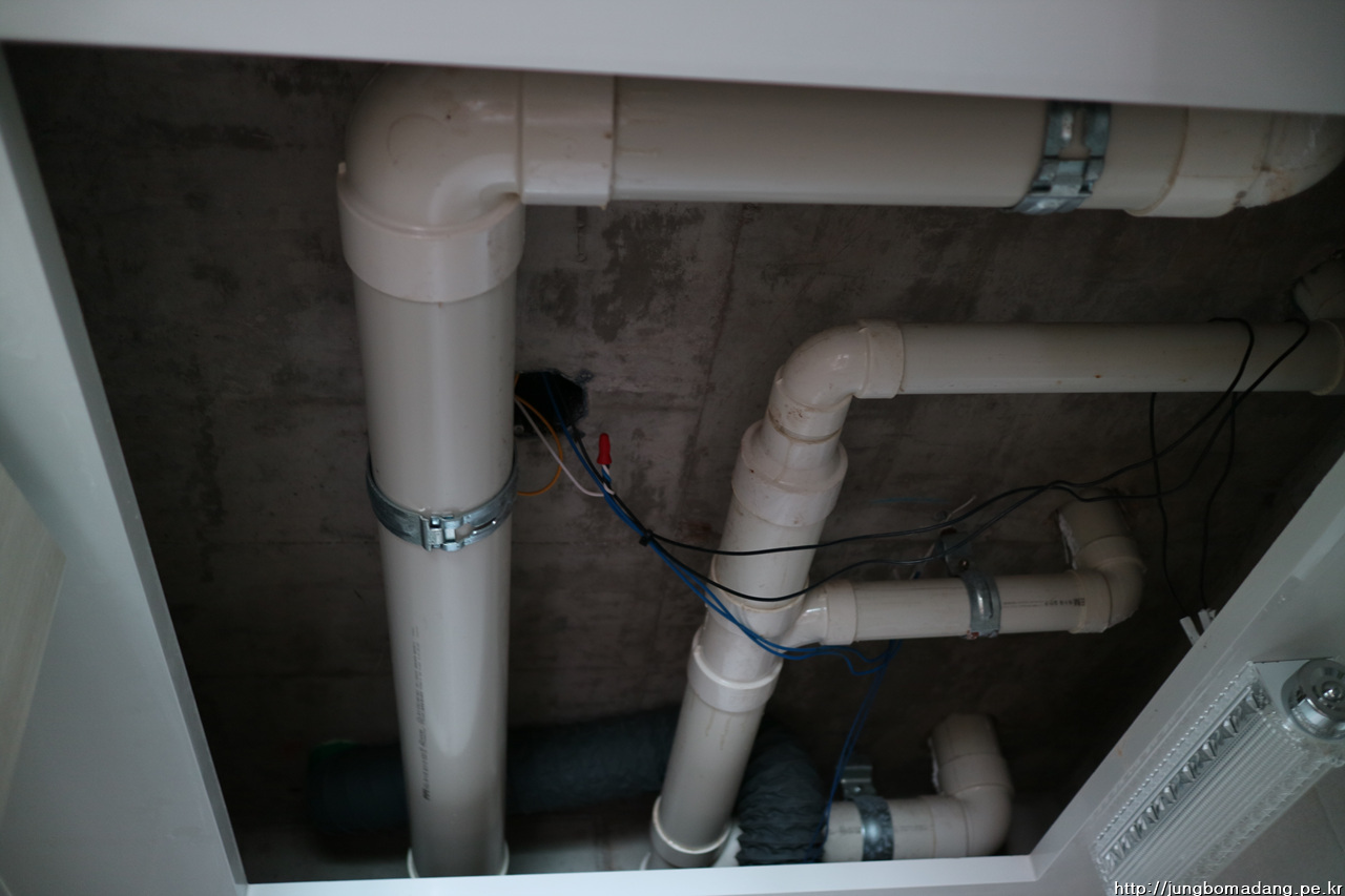 다방면으로 전문가들을 통해 분석을 하니, 아래처럼 배출구 배관이 직경이 작은 걸 쓰는 덕분에 욕실내에 큰배관과의 지름 차이로 안쪽에 찬 물이 고여 있어 욕실은 따뜻하니 결로가 발생하게 되는 겁니다. 도대체 이렇게 정신나간 시공을 하는 사람들은 뭔지? 배관 크기를 똑같이 써야지 이사람들아! 아무것도 모르는 나도 알겠구만 쯧 쯧 쯧