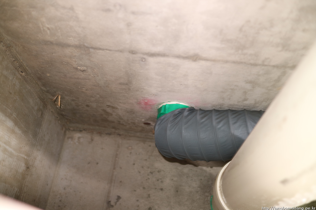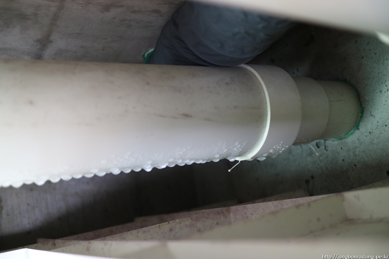 뚜껑을 열면 아래 사진처럼 굵은 배관(100mm) 안쪽으로 결로 현상이 있습니다.
