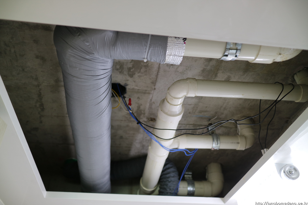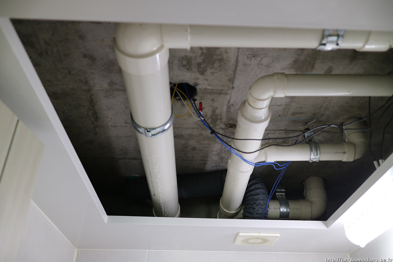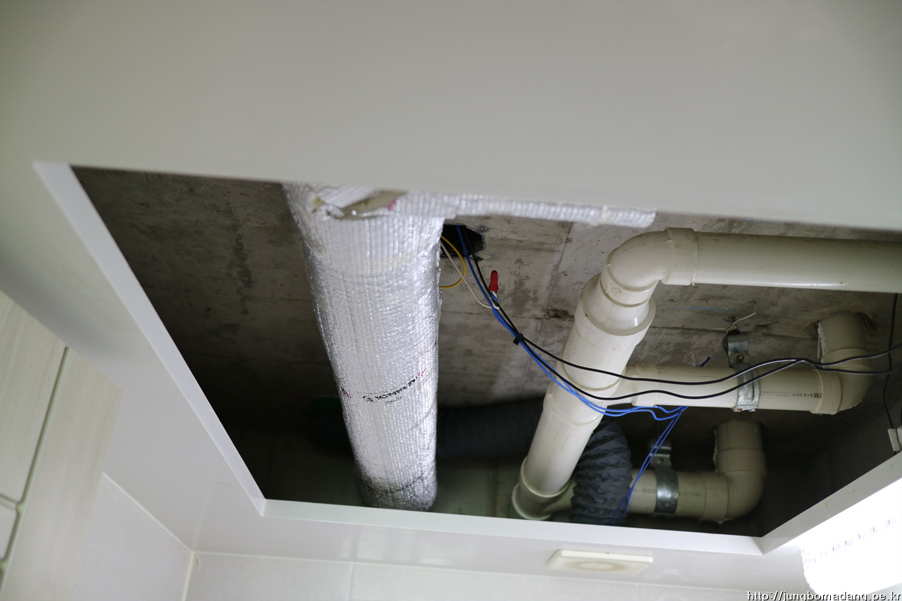 돔천정 뚜껑 틈 사이로 물이 한방울씩 떨어지길래 뚜껑을 열어 보니 배관들 겉으로 결로가 엄청납니다.