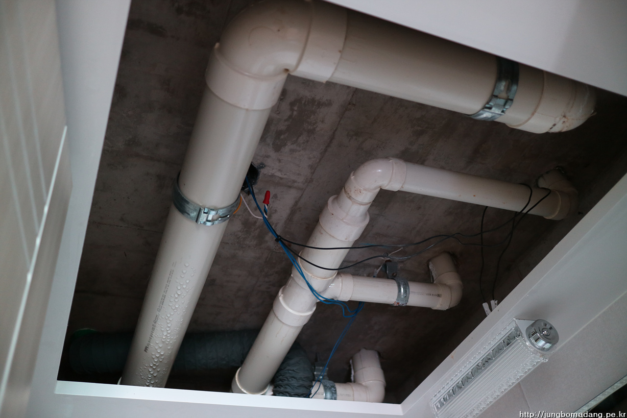 돔천정 뚜껑 틈 사이로 물이 한방울씩 떨어지길래 뚜껑을 열어 보니 배관들 겉으로 결로가 엄청납니다.