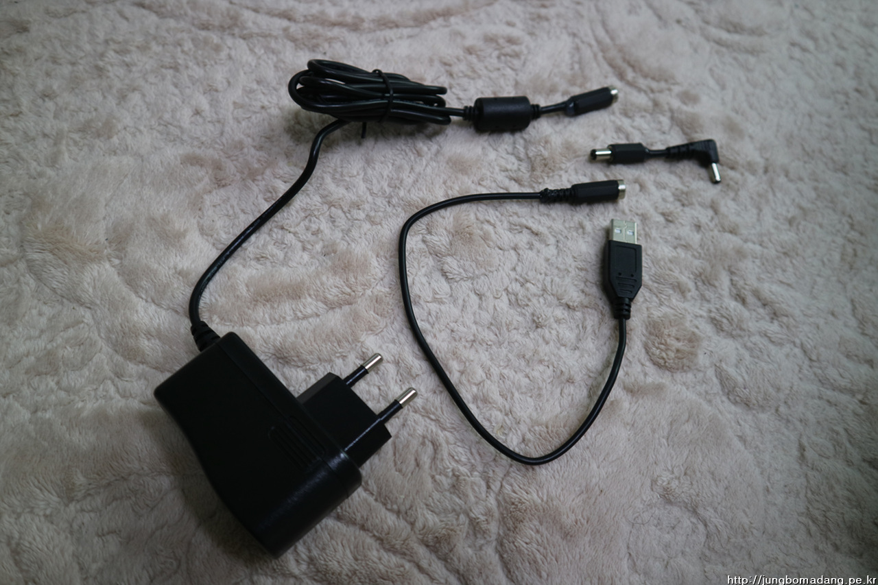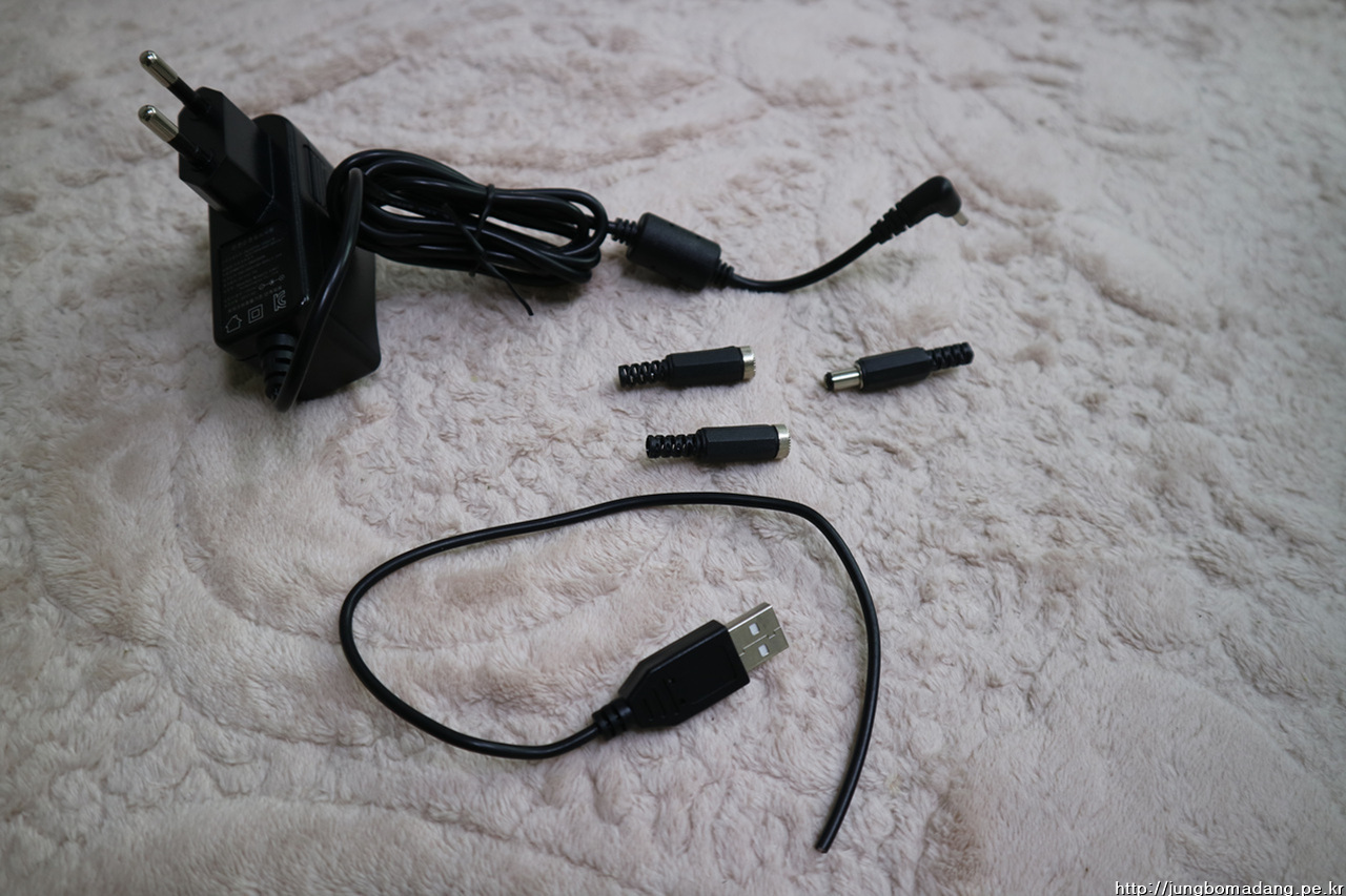 왼쪽부터 노트북 전기 충전기와 가운데는 USB 연결용 케이블 그리고 오른쪽은 노트북 단자에 연결될 커넥터 부분이죠.