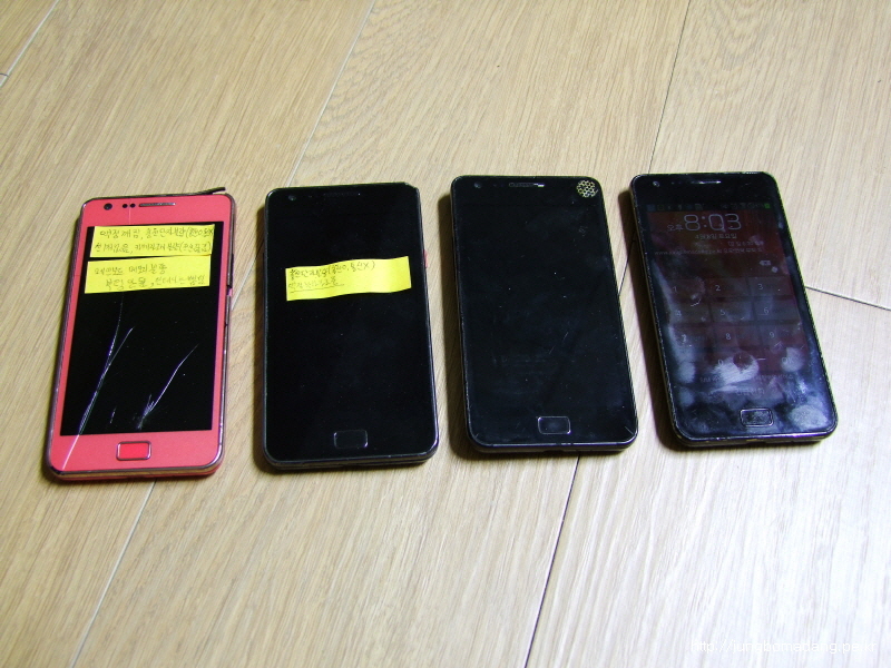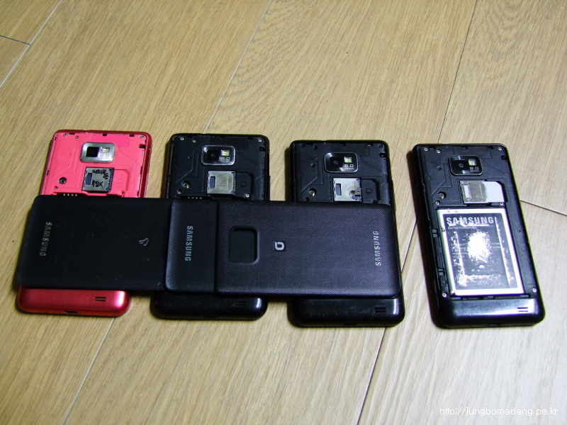 집에 이렇게 4대의 갤럭시S2가 있기 때문에 직접 고치고 있죠. 메인보드가 멀쩡한게 이중에 한개밖에 없어 그걸로 교체하고, 추후 새로운 공기계를 재구매하던지 해야겠네요. 유심이 마이크로 유심이라 결합하는 데 핀에 걸려서 부러지는 일이 종종 있네요. ㅡ,.ㅡ"