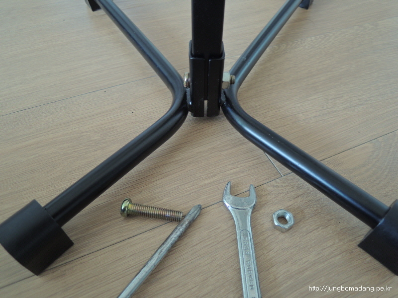 아랫쪽에 구멍을 맞춰서 구멍 2개중에 아랫부분꺼를 우선 끼워서 스패너와 십자 드라어버를 통해 충분히 조인 후에