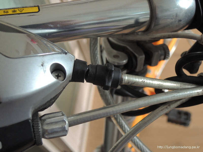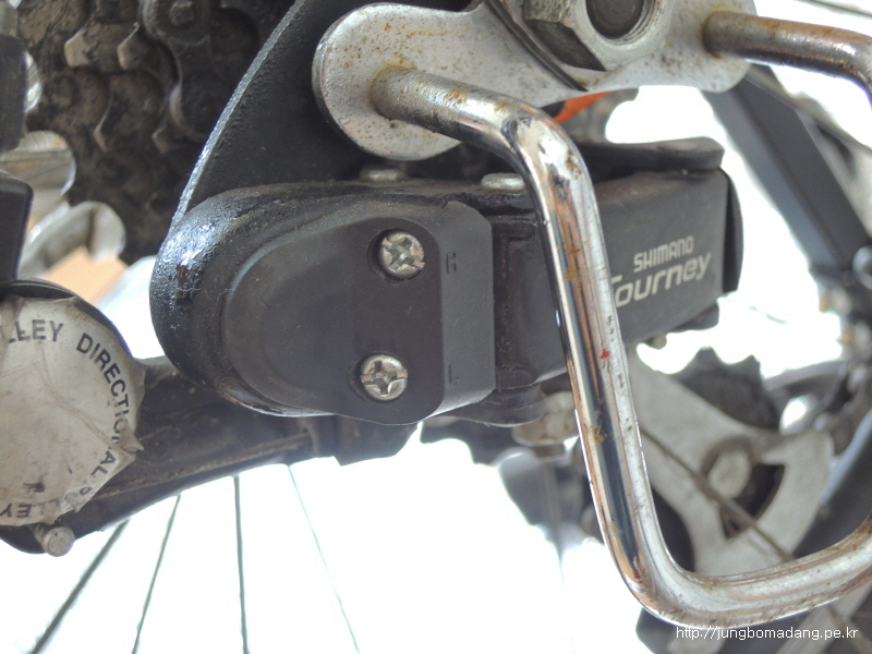한계조절나사로 조절이 안되면 아래 은색 기어선 장력 조절하는 부분을 돌려가면서(조이면 기어선이 느슨해져서 바깥쪽으로 이동, 풀면 조여지면서 자전거쪽으로 이동) 조정을 합니다.