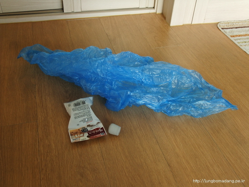 두둥~ 파란 쓰레기봉지 아시죠? 집에 다들 있으시잖아요? 그걸 모서리를 체어슈즈를 끼울수 있을 정도로 커터칼(가위)로 잘라냅니다.